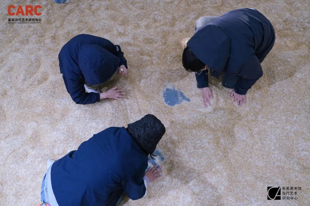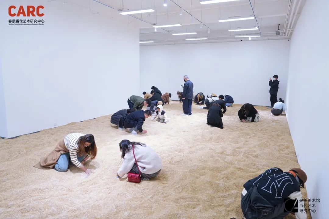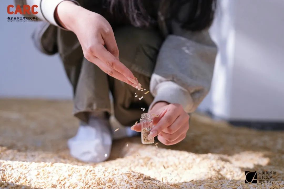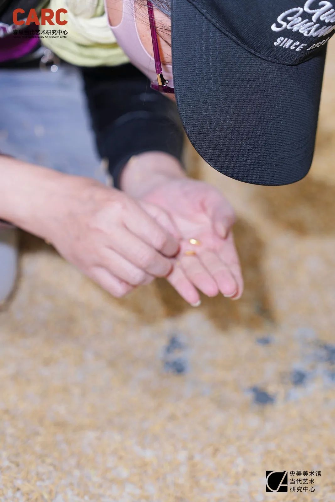在这场别开生面的艺术现场中,艺术家杨烨炘把千足金的1000粒黄金米洒进铺满展厅的大米里,之后,特邀来宾与预约观众按照分组人数,每组15人进展厅淘黄金米,限时15分钟,期间所淘到的黄金米在现场用小玻璃瓶承装,归淘金者,合影留念。淘金者不得用探测工具,只凭双手。
