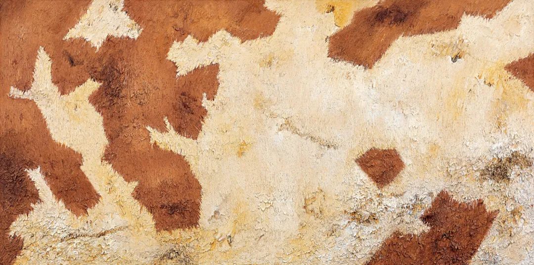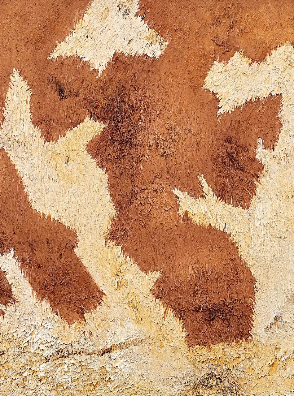 完成于2013年《牛皮No.12》,为闫冰炙手可热的经典「牛皮」系列之作,以两米的尺幅震撼呈现,为过去拍卖市埸可见第五大尺幅的「牛皮」主题之作,磅礡展现一块牛皮所能铺展的终极景致。《牛皮No.12》与其说是画出来的,不如说是以双手「塑」出来的。那些远看逼真、泛着光泽、带着层次渐变的毛皮,近看却是一簇簇张力十足的颜料体,如同熊熊跳动的火焰般,将生命力凝结在画布之上。而那如花朵盛开的棕褐斑点,以几何式的纯粹极简,诉说着世界地图般的磅礴。凝望画作之时,似身处高空,俯视着五大洲、四大洋那历经上亿年地壳变动方形成的今日,在看似理性写实的表象下,隐含着细腻、迷人的感性,并最终成为独立的存在。《牛皮》,既连接了闫冰的故土情韵,也串联起华夏农耕文明的历史,以感知一头牛的真切方式,去感知世界的深沉和广博,构建出独特的「精神原野」。