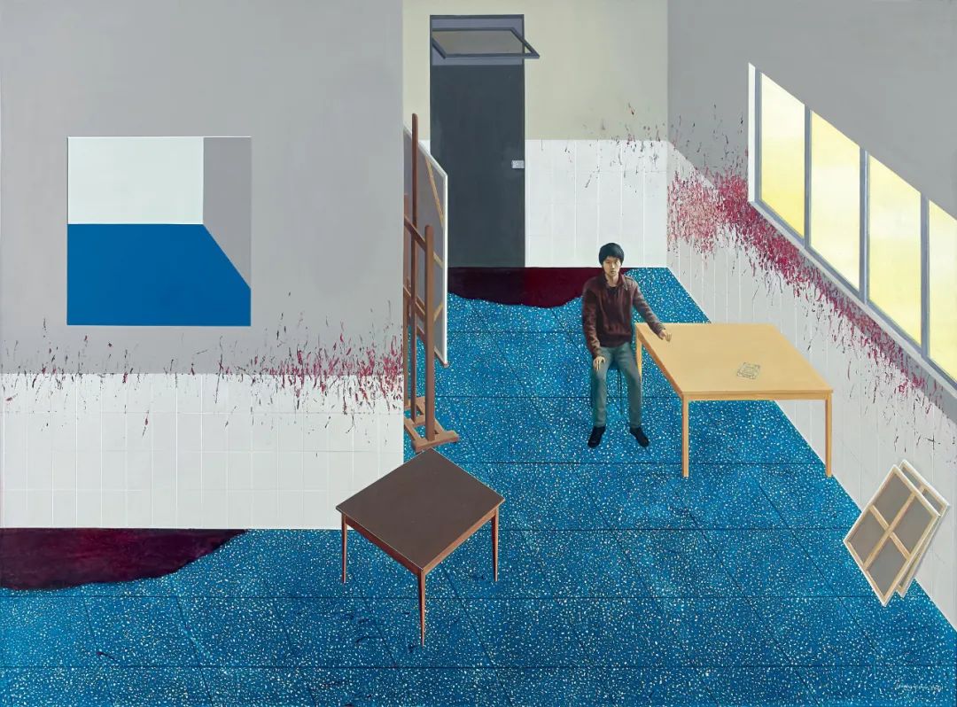 作品以其经典的「轴测图」视角,展示了一个封闭又开放的空间,所有线条、地砖、门窗、桌以极度严谨的方式展现着与彼此的平衡。其以精心调配的特殊顔料在反覆下笔间,营造出具厚度的光滑瓷砖质地。配合严丝合缝的空间逻辑,直指强烈的理性思考,呈现一种近乎「完美的真实」,宣告作者「理性即人性」的宣言。然而那具超现实感的画境,依然瀰漫着虚构感,引人悬念地使之在剧场与现实间游弋。