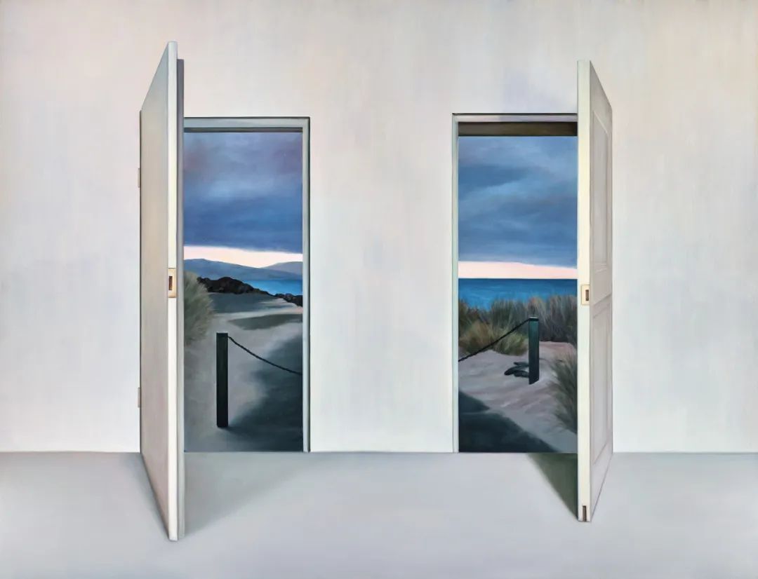 80后艺术家张英楠2005年从西安美术学院毕业后移居北京创作生活,其作以冷静幽微、带有强烈戏剧张力及神秘主义色彩著称。《顶楼》创作于2021年,不仅是艺术家以极度严谨的空间秩序及冷寂梦幻的用色探索内部意识与外部空间之联系的精品,更是融合其经典语言:无限延展的空间、门、悬浮球体及对称构图的集大成者。