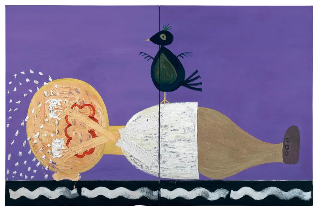 欧阳春心中始终住着一个「孩子」,他擅于以不加矫饰的孩童式绘画来表述心中自然率真的世界。2002年底,他迎来创作的高峰及重要转换,从早年以灰色调为主的「灰色时期」步入大量使用纯色、用彩绚烂奔放的「金色时期」,创作不逾10件的经典「怕怕」系列即于彼时诞生,《笨鸟怕怕》即为其中生趣盎然的一帧。作品以大面积的亮紫色为背景,呈现一个躺倒在地的男孩,泪汪汪的双眼如喷泉一般爆发出眼泪。而每一颗泪珠以硕大的珍珠白色厚彩点出,具有近乎雕塑一般的立体质感。吓倒男孩的是其身上单脚停落的一只小鸟,睁大的眼透露出呆萌和无辜,而其瘦小的翅膀与身躯不成比例,似乎暗示了它是飞翔才能不足的一只「笨鸟」。此中暗涵的「笨鸟先飞」指涉,与绘画天分优异、反感应试教育的窠臼、最终在绘画的天地中找到了心之所向的欧阳春相呼应,传达艺术家「笨鸟不必先飞」的温暖的人生哲学。欧阳春以夸张化、儿童化的情绪表达对此种教条化的社会束缚发出诘问和挑战,呼吁人性的释放,展现其内心深处的率真和单纯。