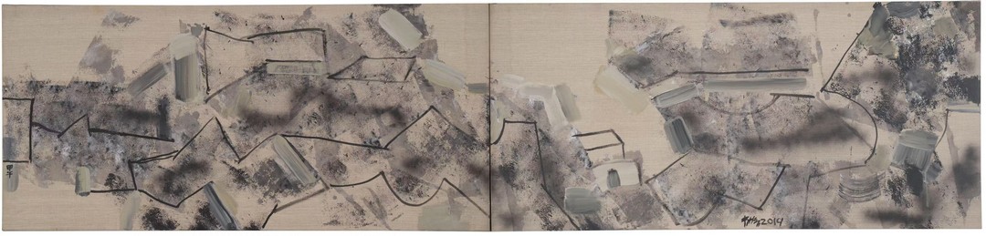 在丙烯作品中,王劼音则以更具实验性的方式拓展色彩的表达,让画面呈现出更加多元的视觉张力。相比传统水墨的渗透性与流动感,丙烯赋予了作品更强的实体感和色彩表现力。常用的石青色、灰褐色和米灰色,从历经千年而形成的敦煌壁画中借鉴得来,滤除了人间的烟火气,显得古朴苍凉、绵柔典雅、底蕴丰厚。滴痕斑渍、薄涂笔触与硬笔线条交织,水墨、水彩、油彩、丙烯、麻布等多种媒材的物质属性,形成语言上的对比和变化,重新演绎了水墨的精神。