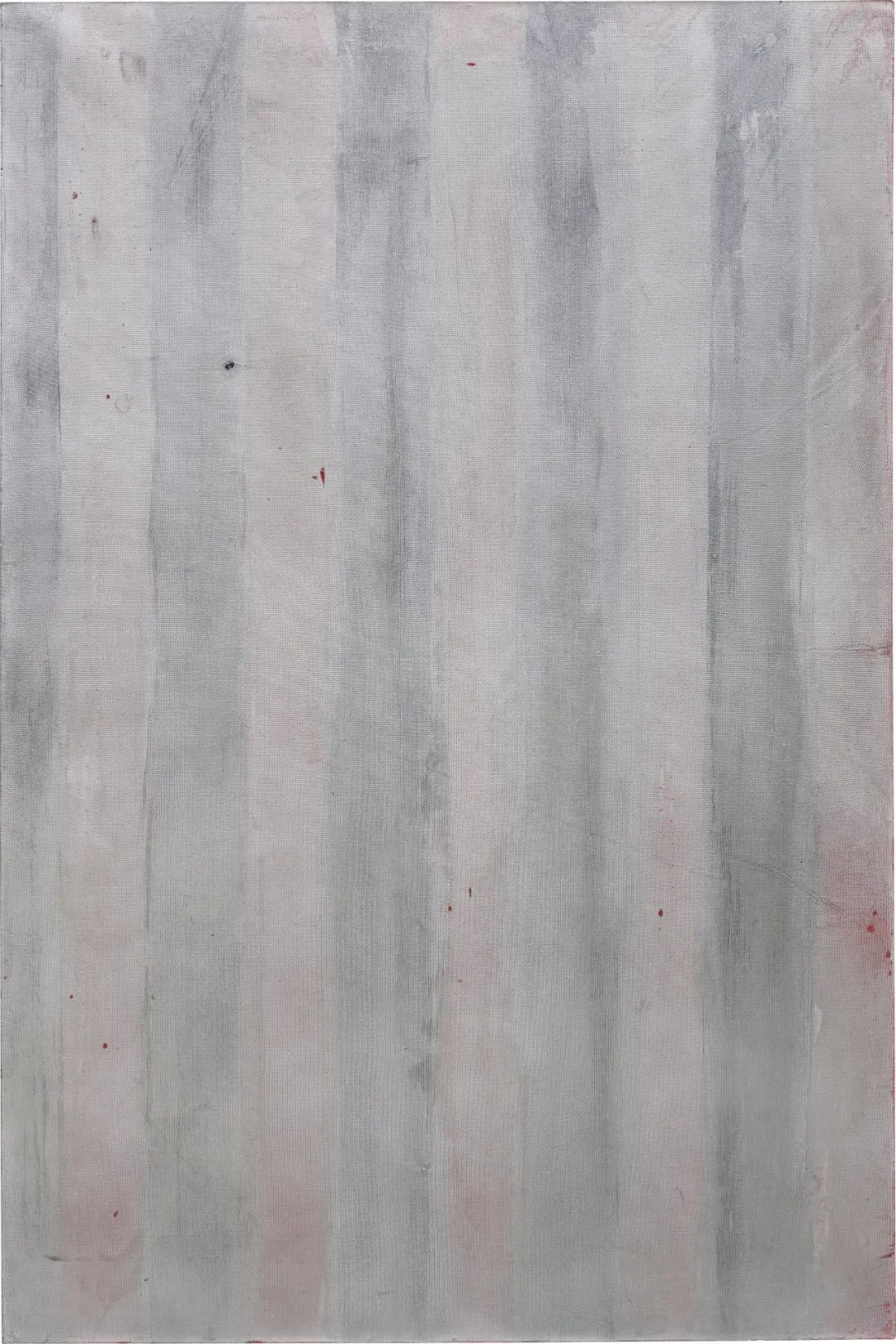 艺术家以对绘画材料与媒介的颠覆性探索闻名。其1989年创作的《无题》属早期“银色绘画”系列,银灰与铁蓝的垂直条纹下隐现红色底漆斑点,表面如薄纱般闪烁,既吸引又抗拒凝视。作品形式上呼应纽曼、马丁等极简主义美学,内核却指向对创作神话的解构——将银釉透过网纱布喷于画布,剥离后织物褶皱与裂隙成为唯一“手工”痕迹。