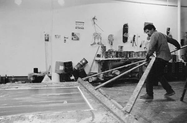 他最令人难忘的形象,莫过于使用自己发明的美工器材沉醉忘我地进行创作。在他的工作室,人们经常能看到他像挥舞镰刀收割麦穗一样操纵这个木制装置,将3米多的长臂划过一层又一层的颜料。根据所需的表面效果,他会用橡胶刮板、锯齿梳和金属刀片等附加组件对设备进行改进。