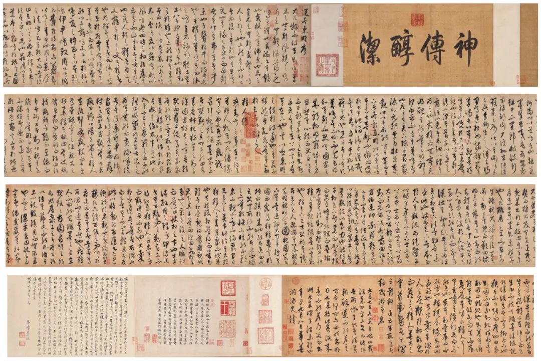 《草书韩愈柳宗元文》展现了饶介在书法艺术上的卓越造诣,以草书形式书写了韩愈的《送孟东野序》和柳宗元的《梓人传》。此卷流传有绪,根据鉴藏印和著录文献记载,曾为明代著名收藏家项元汴所藏,清初归于收藏名家安岐,后入清宫,成为乾隆皇帝的珍藏。乾隆皇帝对此卷极为珍视,不仅亲自题写了引首「神传醇洁」,还将其收入《石渠宝笈续编》和《三希堂法帖》。之后,此卷藏入恭亲王府,在20世纪初期又辗转流入民间,远渡东洋,成为日本收藏家石川舜台的珍藏。