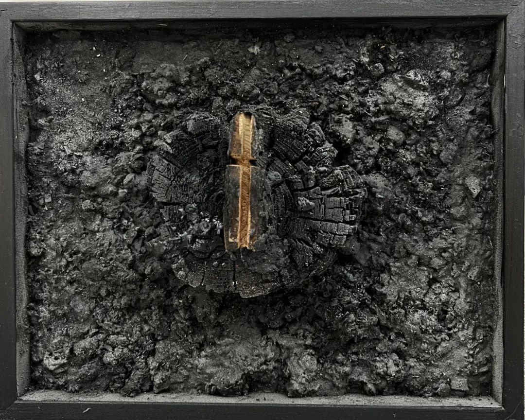 45 × 50 cm,火烧木、丙烯、炭渣、沥青,2023年