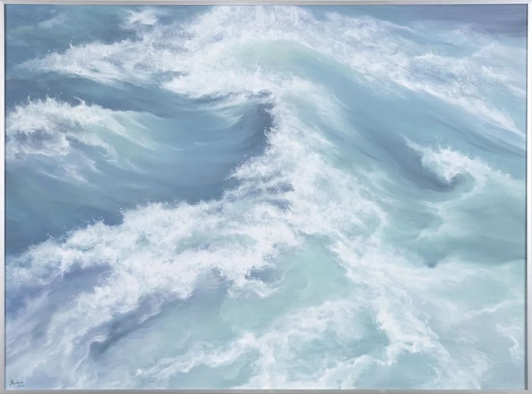 当“水何澹澹,山岛竦峙”被朱可染赋予当代视觉的诠释,瞬间与永恒的并存似乎便不再成为一种悖论。就像她说的,“云和水是转瞬即逝的,它们的形态每一秒都在变化,而我的绘画语言正是为了定格这种动态的节奏与韵律。”正如法国哲学家柏格森的“绵延”——时间不是由分离的瞬间组成,而是一种连续的流动。她恰好捕捉了流动的本质,将柏格森的理论演化为感官的体验。