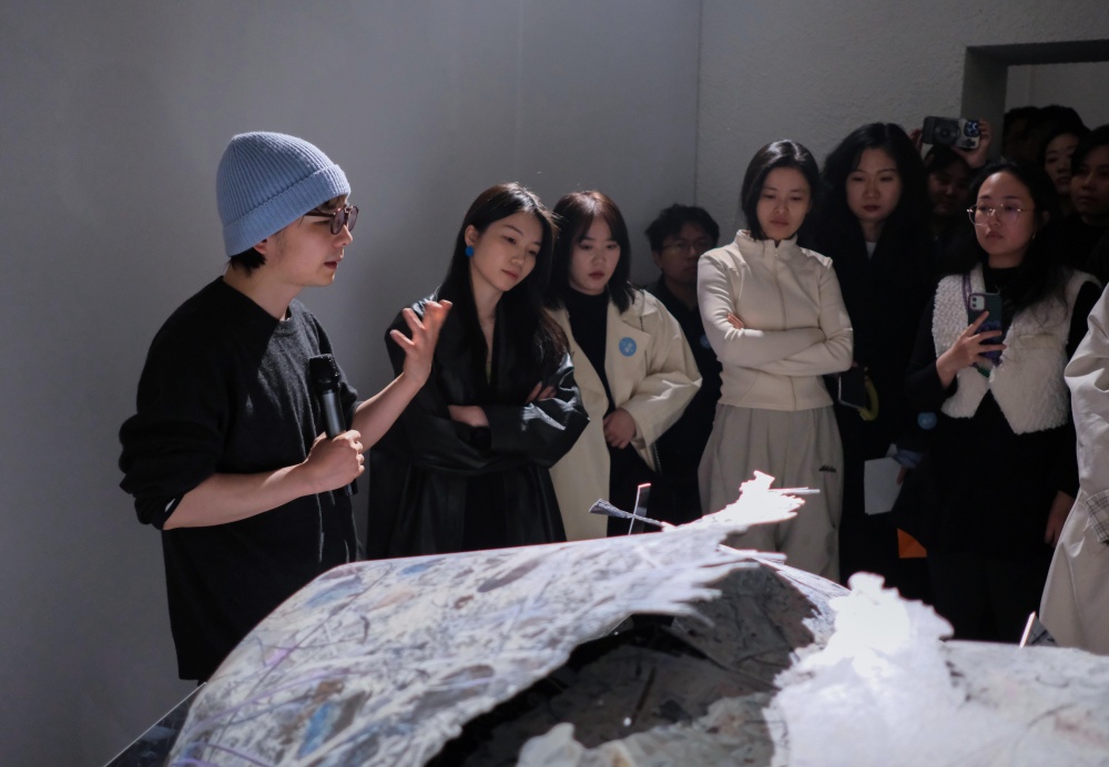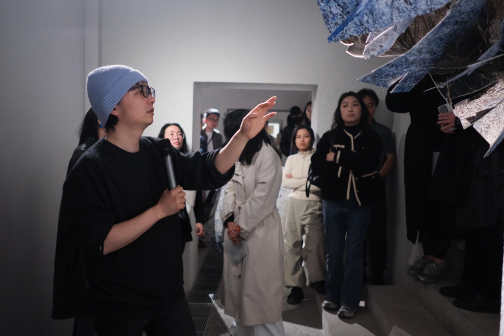 在随后的导览环节中,艺术家与策展人共同为观众深入解析了作品背后的构思与哲思。谭英杰从创作的第一视角出发,详尽讲述了其如何通过图像的切割与重组构建出作品庞大的叙事空间;唐一菲则在阐释展览脉络的同时,引导观众体会作品所揭示的城市高速发展背景下,自我意识的生成与流失过程。