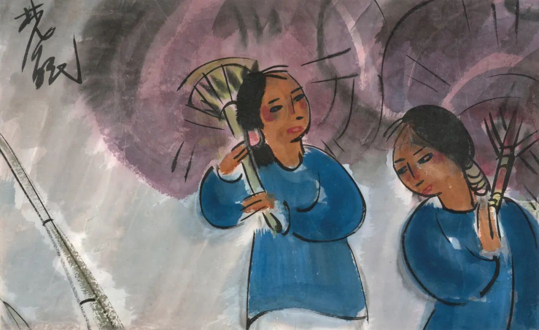 两位少女,著粗布蓝衣,观其装束,似当地苗民。她们撑油纸伞,顾盼相望,疾雨中赶路,形色匆匆,极富生活气息。本幅于一九九四年秋在香港拍卖会上释出,考其来源,乃出自一位女士珍藏,同一来源尚有另四张林风眠人物画作,皆林氏较早时期作品,线条流畅自由,造型具西方现代风格,足可窥该藏家甄选林氏画作之不俗品味。