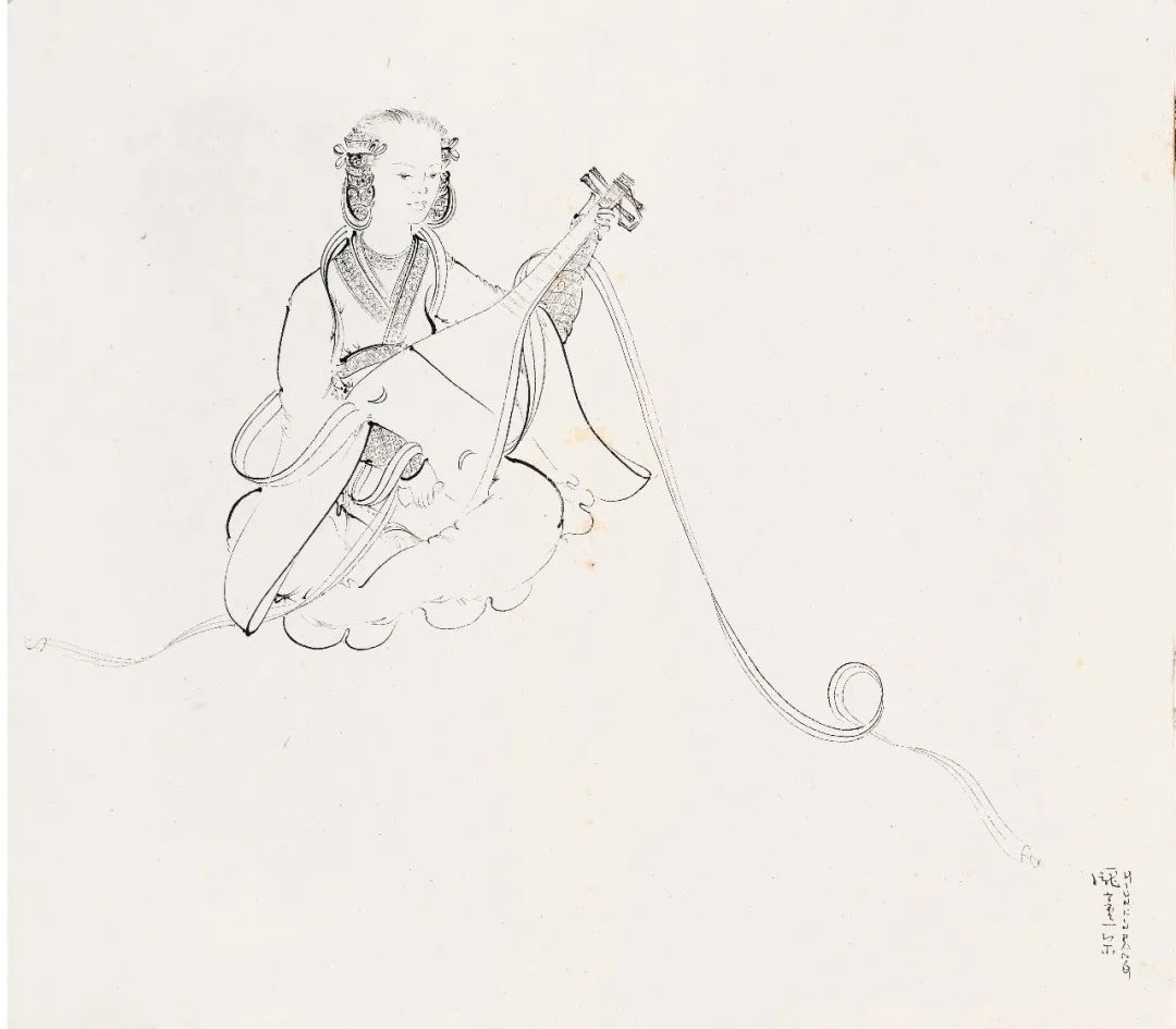 本幅为庞薰琹经典古装仕女白描之作,此类作品仅在二十世纪四十年代见于庞氏笔下。画家通过运笔缓急的控制,用轻重浓淡起、充满动感的线条,表现仕女手持琵琶拨弄抚弹,似有轻盈的音符流出画面。难怪庞薰琹自言此期作品是自己“所绘白描中最精彩的一部分”。