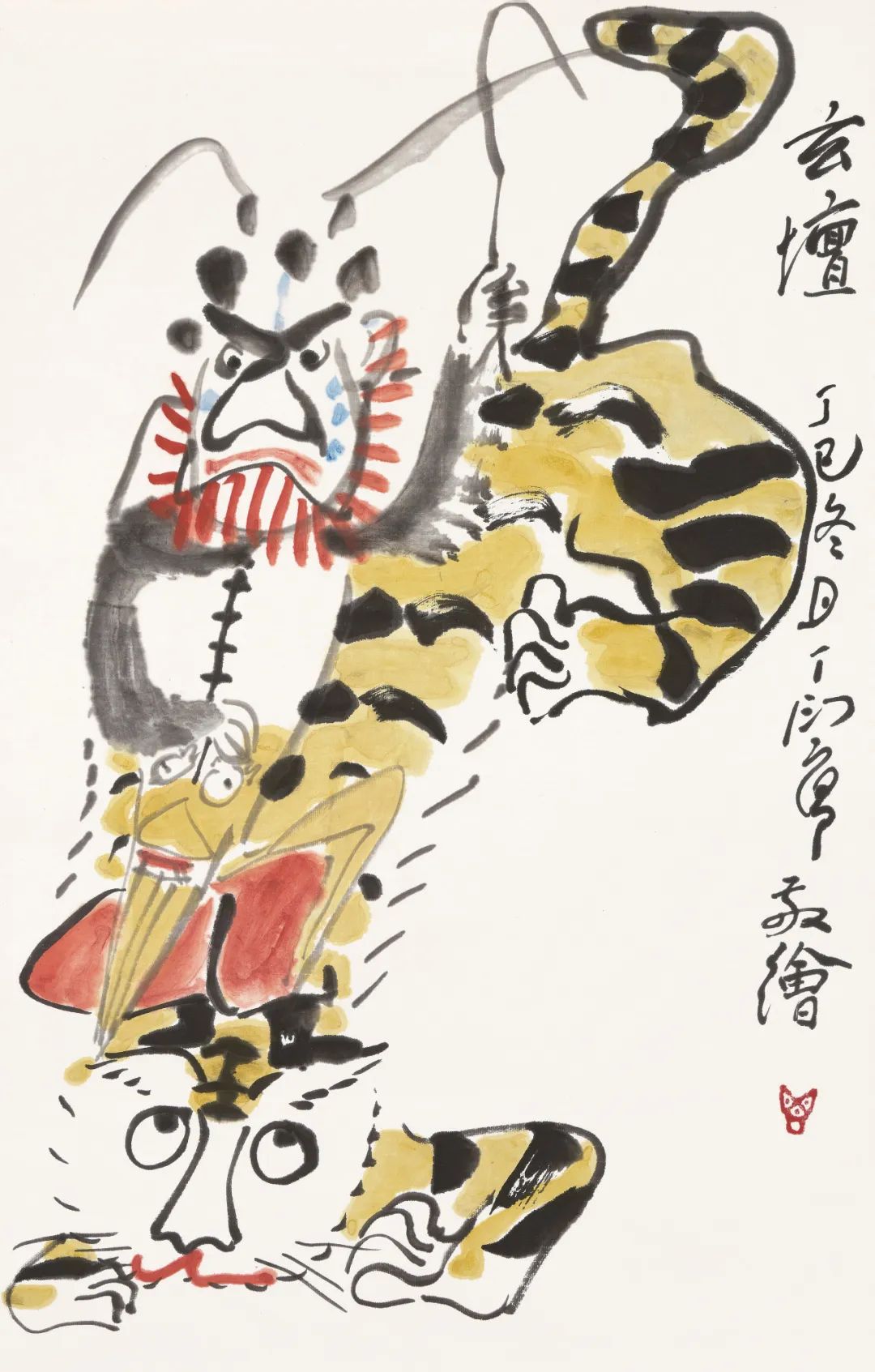 本幅所绘乃玄坛赵元帅,世称“黑虎玄坛赵公明”。赵公明是道教护法大神,役雷驭电,祛瘟禳灾,主持公道,元明以后,遂演化为民间尊奉的财神。其形象黑面浓须,头顶铁冠,手执缚龙索,将身跨虎,威猛非常。丁衍庸以诙谐之笔调演绎民间神灵,颠覆旧规,然不失敬意,寥寥数笔,便将玄坛之英武神威、奇崛生趣跃然纸上。