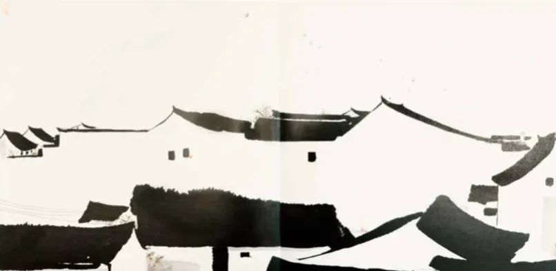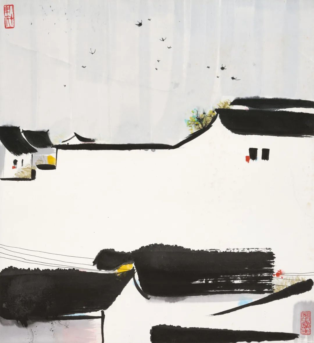 画面取斗方形制,中分天地。天空灰色淡墨,浅敷一层,如雨后低云,空灵清明;中间屋檐分割,墙面留白;底部浓墨横扫,绘出门窗、屋檐,几笔细线,勾出村落电线,自然流畅;一群春燕,呢喃翻飞。