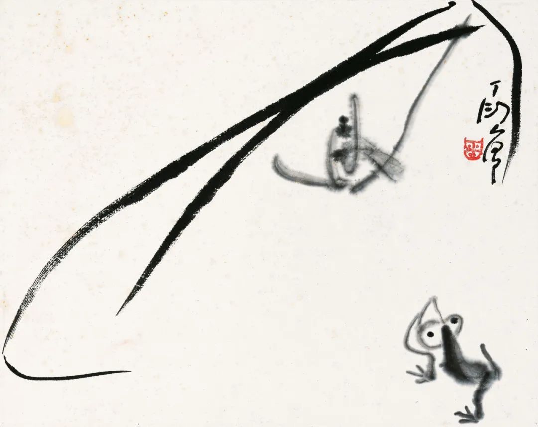 本《集锦册》,绘虾蟹、青蛙、仙鹤、玉兰、葫芦鸣虫、葡萄、牵牛,皆丁公擅写常写之经典题材。各开构图设色各不相同,或水墨,或设色,或繁、或简,诙谐幽默,趣味横生。其中“仙鹤”一帧,乃一笔绘成,丁公手眼功夫,尽出笔下。