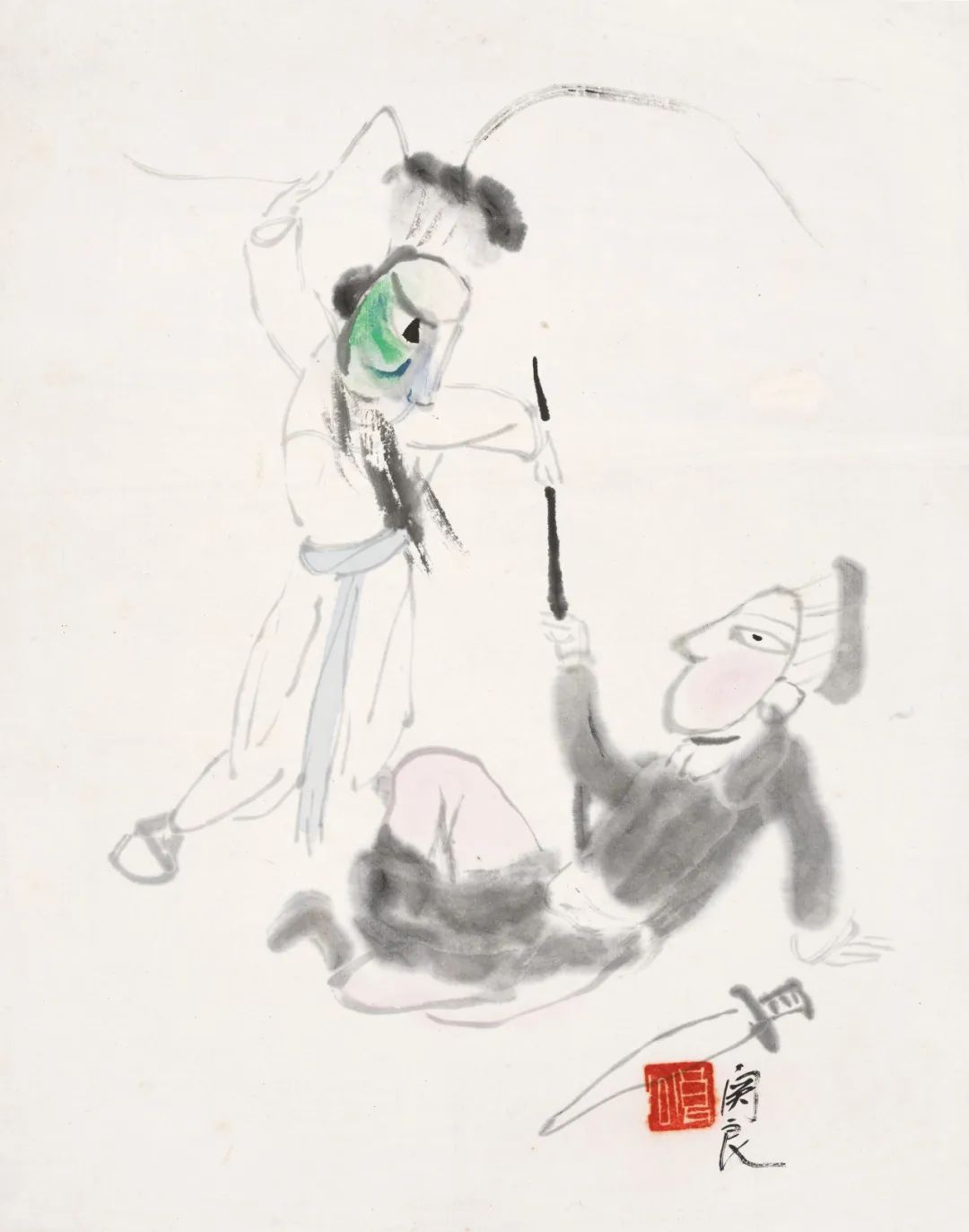 本幅表现京剧《白水滩》中青面虎许世英与十一郎穆玉玑打斗场景。本幅用墨简淡,淡绿浅粉一则表明人物身份,二则增添画面对比,寥寥数笔,人物凝练,生动传神,应为良公1940年代难得之戏剧人物佳作。