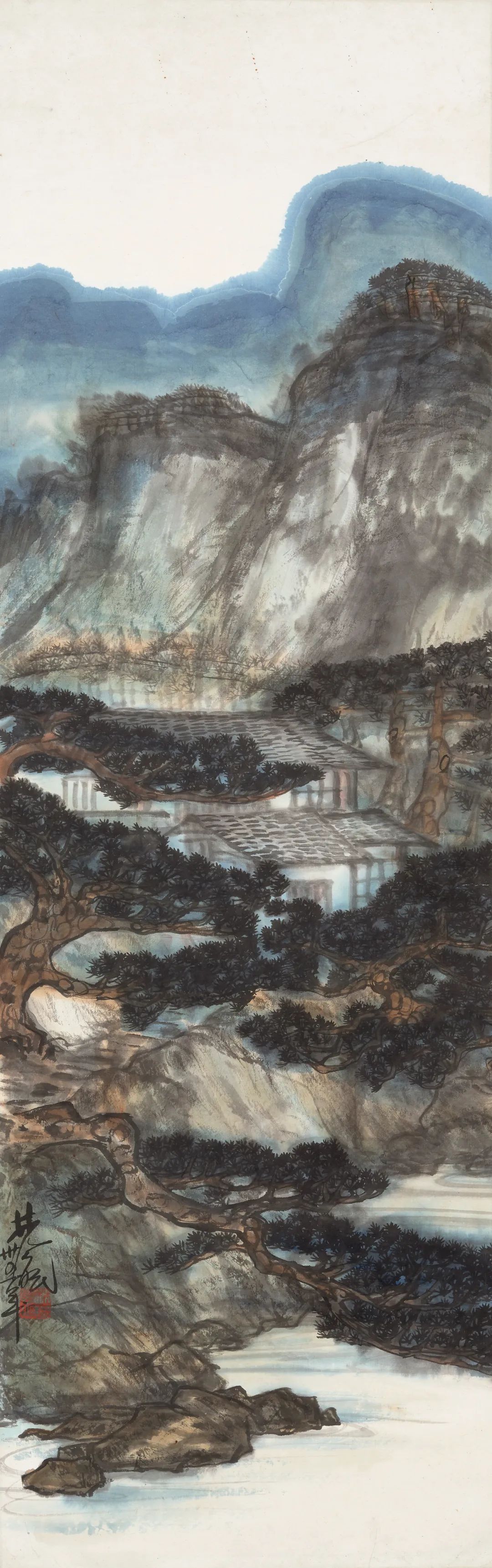 本幅乃林风眠不多见署有年款的作品。中式条幅构图,远望山岭耸翠,雨色天青;中部劲松斜横,密枝虬曲,掩映村舍;近处江水拍岸,山石嶙峋。林风眠以中国画传统的花青、赭石以及水墨为材料,绘于生宣,水分延散开来,层层氤氲,画出并不全然中国的风景。一九四六年五月,林风眠返回上海与家人团聚,离开重庆时,他祇带走一捆画,其实也带走了一支不一样的画笔。