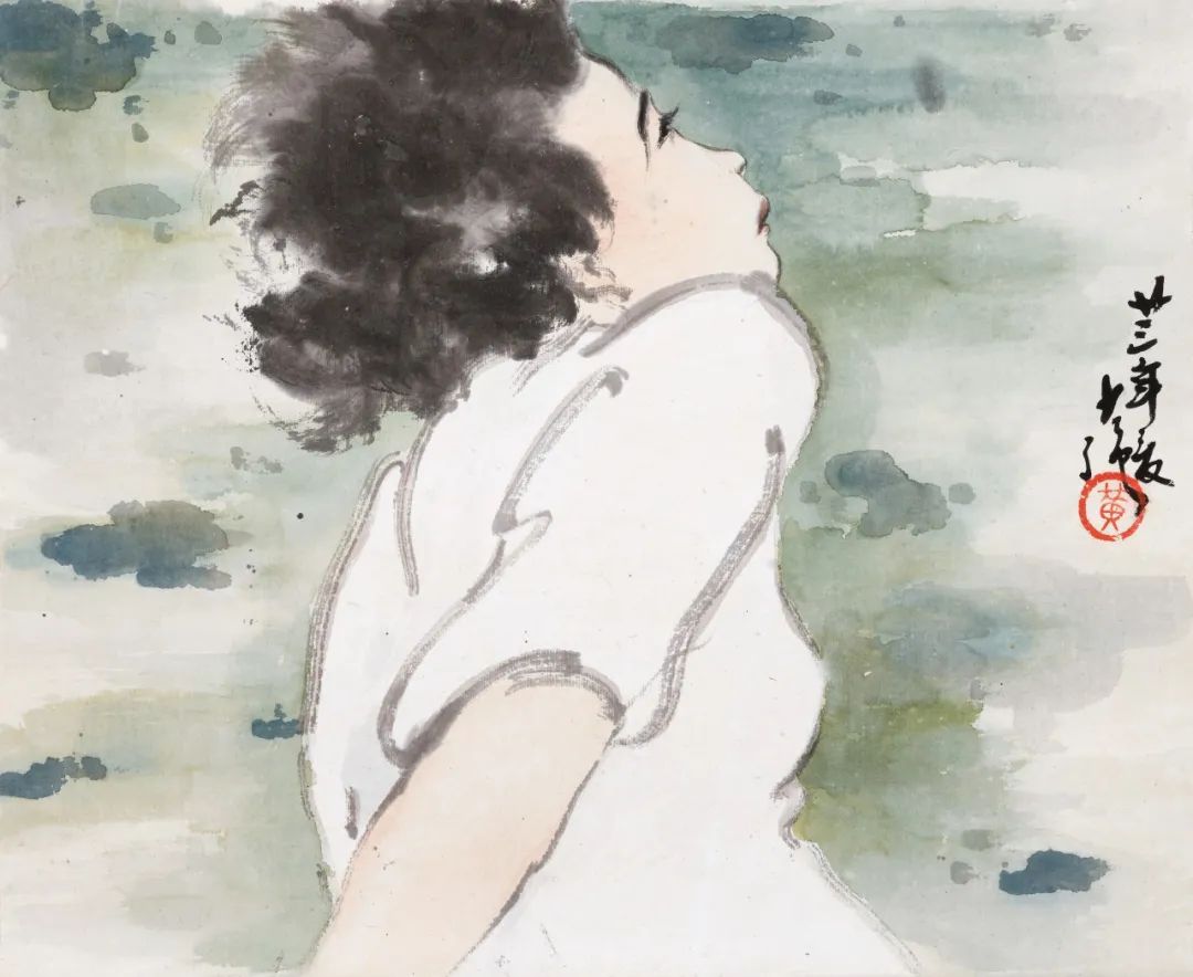 本幅绘仕女纤纤素手,秋波媚眼,樱桃小口,团扇轻掩,除以浓墨染成发髻,馀者皆以淡墨游丝写就,高古雅韵。钤“三企画印”及“醉心”二印,乃李可染早年人物画常用之印,应为其1940年代作品。当时同在四川的老舍非常推崇李可染早年人物画:“他会运用中国画特有的线条简劲之美......极聪明地把西洋漫画中的人物表情法搬运到中国画里来,于是他的人物就全活了。 ”本幅同稿人物,尚有李可染1943年所作《仕女》,屡屡入画,可见乃画家甚为满意之稿。