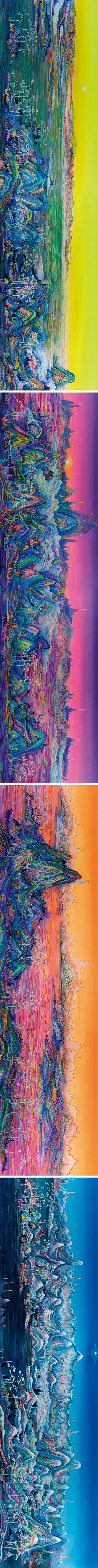 黄宇兴非常擅长利用材料特性带来的视觉优势。他大面积地采用荧光色,将荧光色作为基础色调。这四幅画的基础色调分别是荧光黄,荧光紫,荧光橙和深蓝。强烈鲜艳的荧光色几乎成为他这个阶段的标识性语言。其次,他巧妙地综合了创作时补色产生的分离性和观看时视细胞产生的平衡性。山体剖开,露出骨骸,一圈一圈的橙与蓝、黄与紫,腾光照人,骨肉相莹;险中求生的并置,制造出明亮强烈的色彩对比效果。