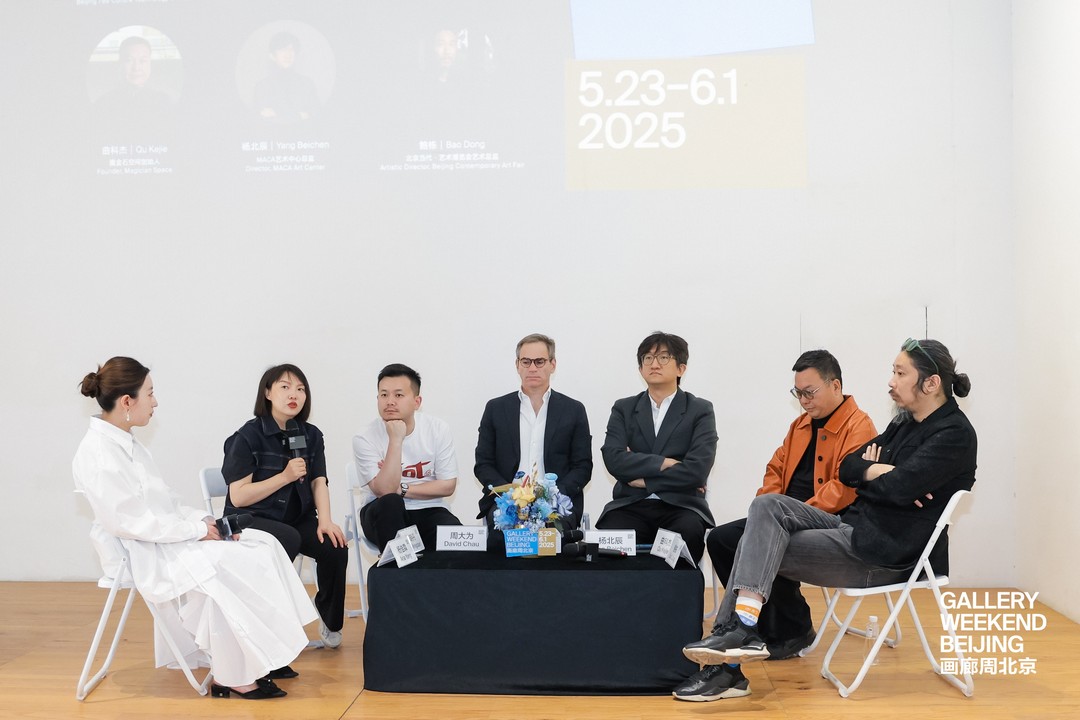 最后的圆桌论坛环节,北京七九八文化科技有限公司党总支副书记、总经理严明丹,UCCA尤伦斯当代艺术中心馆长田霏宇,MACA艺术中心总监杨北辰,魔金石空间创始人曲科杰,零等于一艺术集团联合创始人周大为,北京当代·艺术博览会艺术总监鲍栋共同围绕第九届画廊周北京的新机制与打造北京城市艺术网络等议题展开充分讨论。