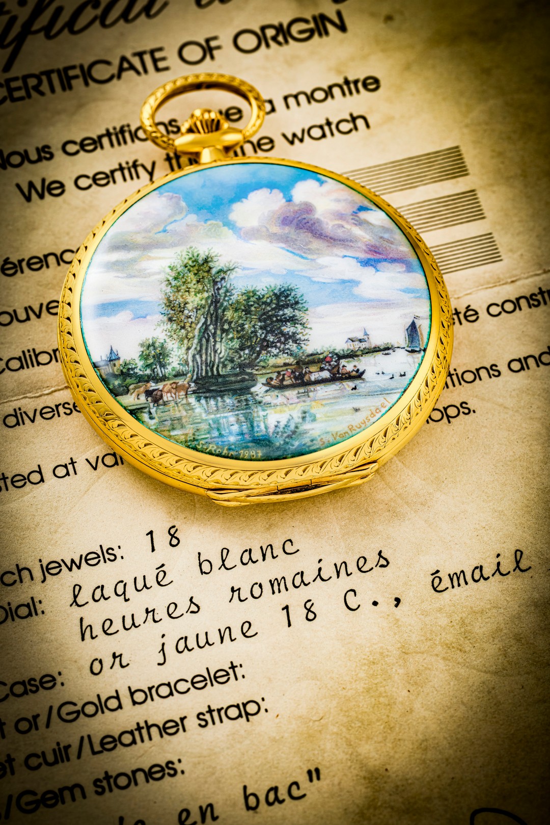 独一无二、重要及耀眼,18K金怀表,配由SUZANNE ROHR制手绘微绘珐琅,描绘SALOMON VAN RUYSDAEL的"PROMENADE EN BAC",型号865/092,约2000年制,附原厂证书、盒子及外包装