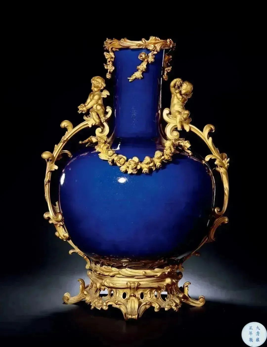 清雍正 霁蓝釉天球瓶(带西洋铜饰)