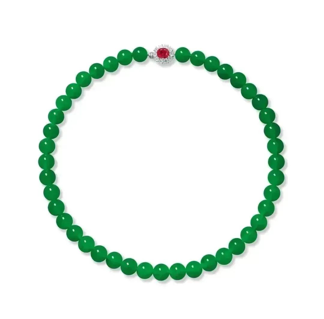 天然“帝王绿”翡翠珠配红宝石及钻石项链