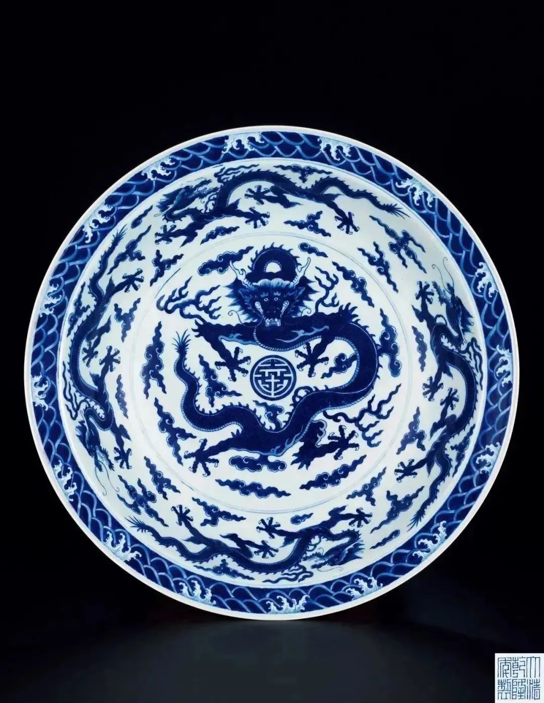 清乾隆 青花海水云龙捧寿图折沿大盘