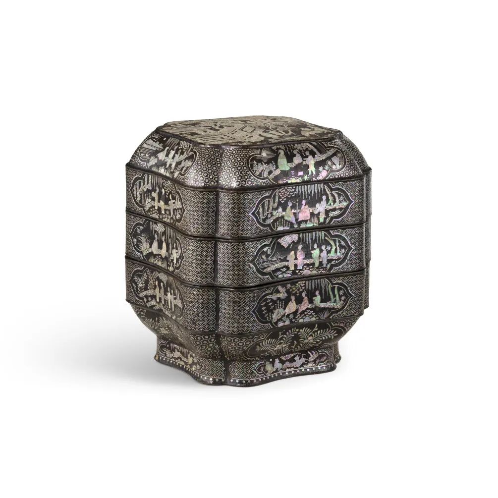 元末明初 黑漆嵌螺钿访友图三层委角方盒