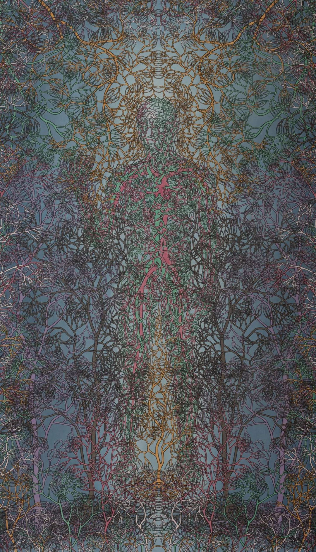 劳同丽, 《自我与他者06号》, 绢本工笔重彩, 243 x 141 cm, 2023. 致谢墨斋