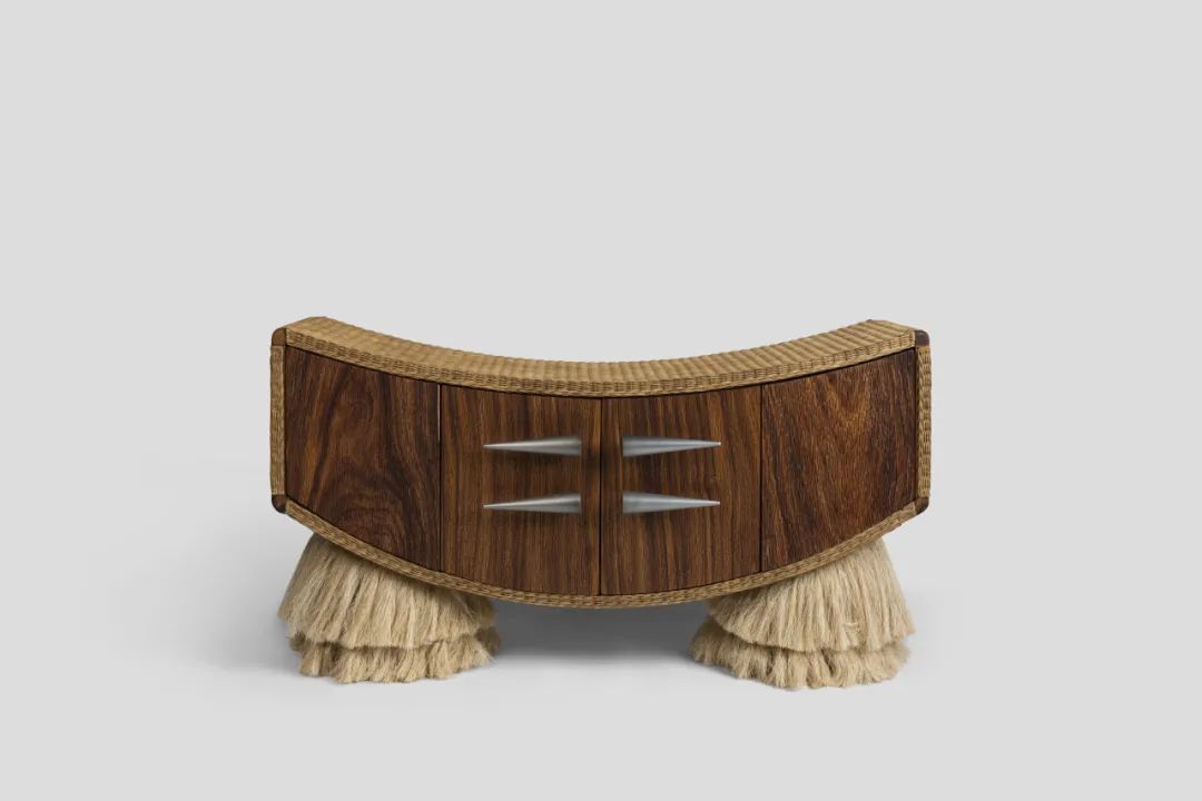 Comité de Proyectos, 《餐边柜 - 拉蒙》, 原钢、剑麻纤维、纹理胡安卡斯特尔木、藤编,170 × 50 × 90 cm, 2025. 致谢眼镜蛇画廊