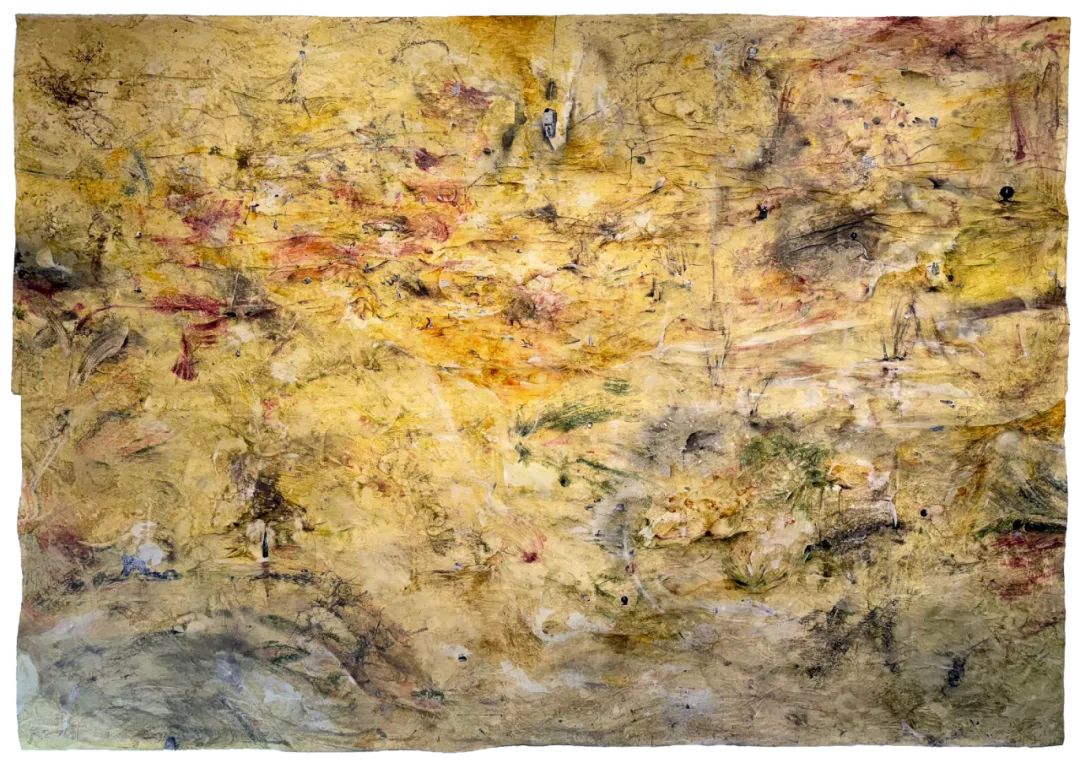 王行云, 《无题》, 墨水、水彩、染料、胶水、丙烯、彩铅、石墨、沙子、拼贴、纸, 320 × 226 cm, 2025. 致谢桉画廊
