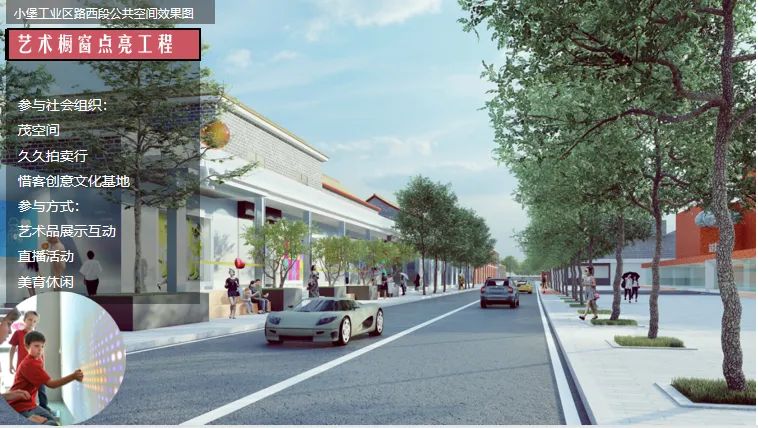 小堡工业区路将被改造为一条充满活力的友好型景观艺术街区,增加艺术橱窗、休憩设施、绿化景观等,提升街道的艺术氛围和休闲功能。