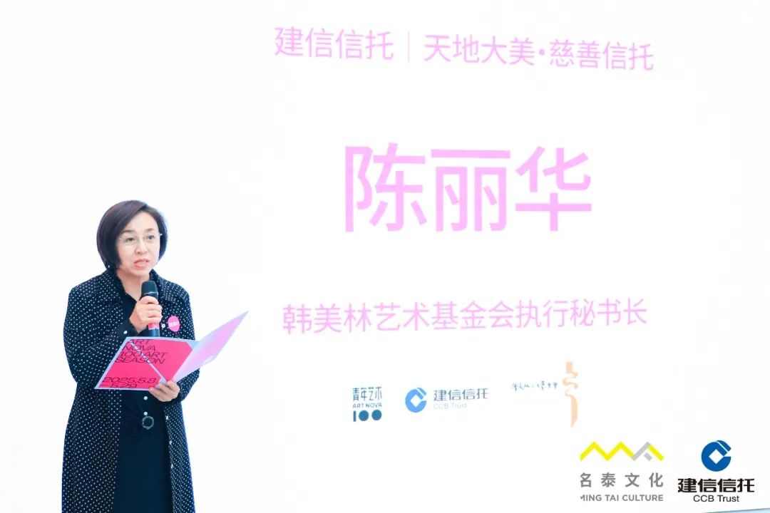 韩美林艺术基金会执行秘书长陈丽华在致辞开始,对建信信托的远见卓识、青年艺术 100 的倾力协作,以及所有支持这一公益事业的同仁们,表示诚挚的感谢!艺术的本源,是对天地之美的敬畏与传递。去年的这个时候,这一理念因慈善信托的设立而被赋予更广阔的意义。建信信托以金融创新助力艺术公益,青年艺术 100以专业平台凝聚青年力量,韩美林艺术基金会则以文化使命反哺社会,三方携手让艺术不再局限于展厅与画布而是成为照亮薄弱群体、赋能社会美育的温暖之光。最后,分享了艺术家韩美林的一句话:“艺术家的天职就是要善待一切,艺术家的责任就是要传递爱和善。”
