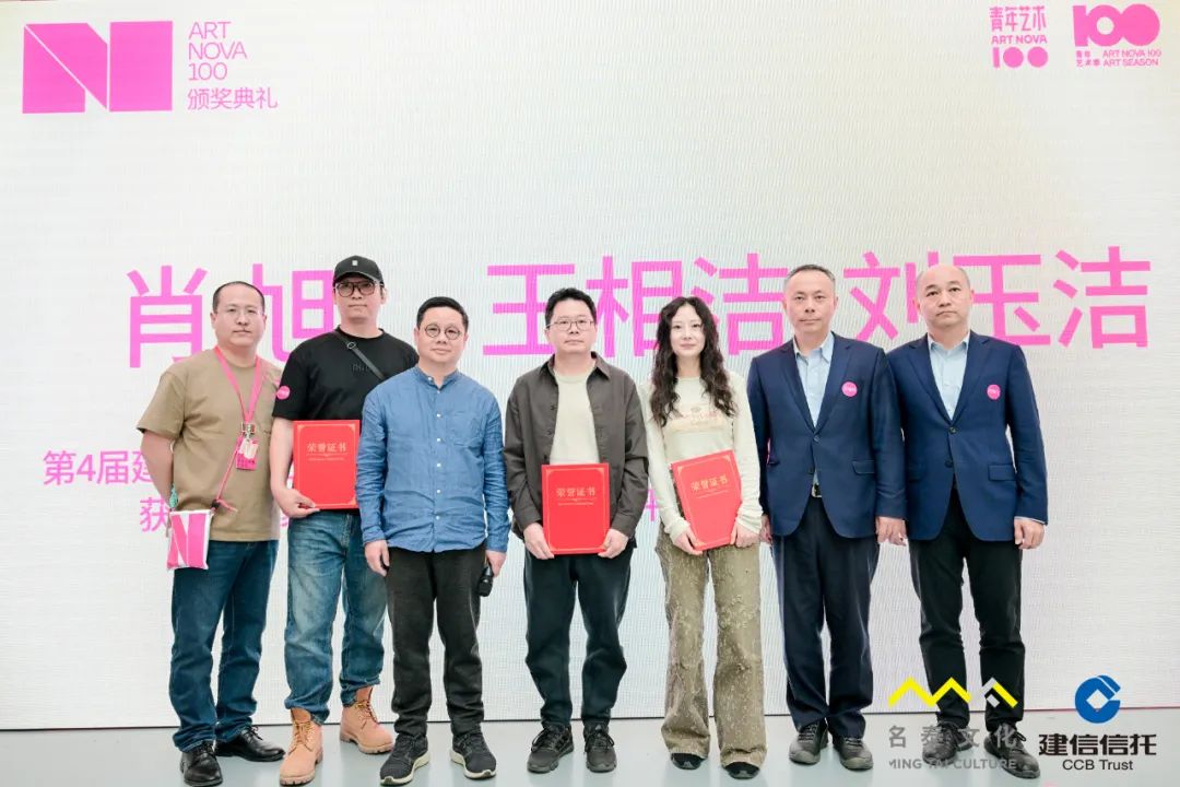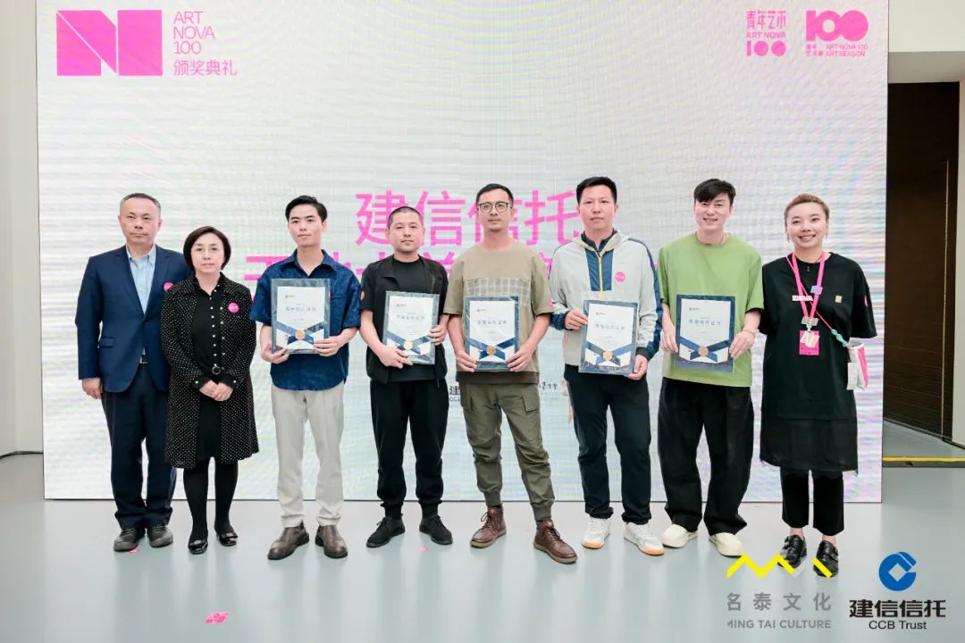 中央美术学院中国画学院院长丘挺教授为肖旭、王相洁、刘玉洁颁奖。左起:北京名泰文化艺术有限公司副总裁宋继瑞、艺术家王相洁、中央美术学院中国画学院院长丘挺、艺术家肖旭、艺术家刘玉洁、建信信托副总裁卫晓东、建信信托财富管理业务部总经理闫晓飞