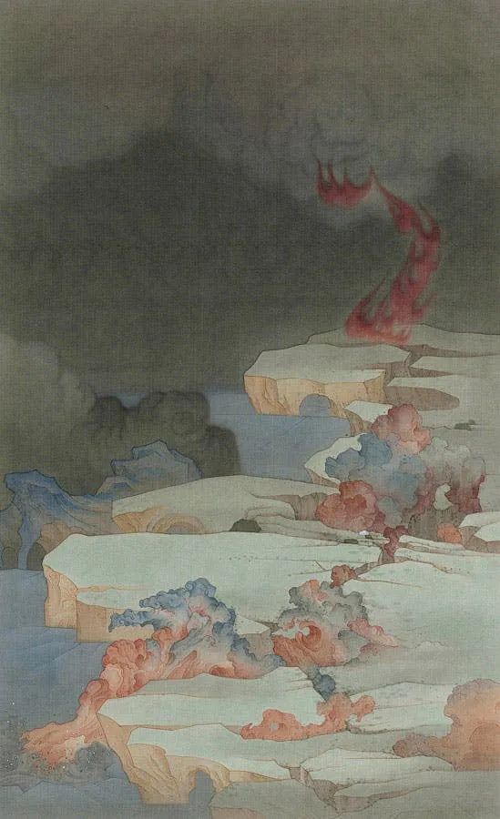 在这幅绢本水墨作品中,郝量以极致的工笔技法描绘了地质断层般的层叠岩壁,却在冷峻的岩石肌理间渗入朱砂般的红色晕染,似花非花,似雾非雾,仿佛地壳深处孕育着某种神秘的生命力。画面既保留了宋代山水“三远法”的空间层次,又通过抽象化的红晕与裂隙,营造出介于写实与幻境之间的张力。标题“地缝”暗示了自然与时间的裂缝,而红色意象可能隐喻血液、能量或宗教中的彼岸世界,呼应了郝量对“不可见之力”的持续追问。作品以新水墨的语言,将地质学的理性与东方美学的玄思融为一体,成为一场关于存在与消亡的视觉冥想。