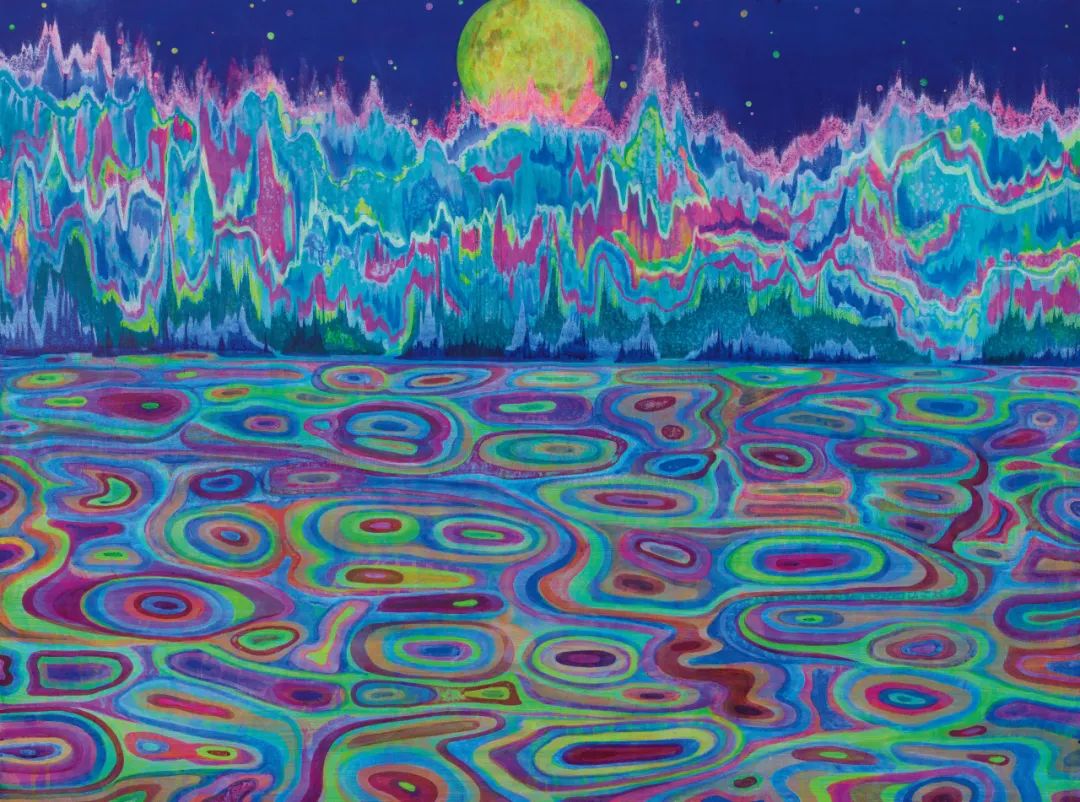 黄宇兴的《春之苏醒》与《月圆》构成了一个关于时间本质的视觉哲学命题。 这两件作品均创作于2018年前后,以其荧光色彩的梦幻质感,超越了传统山水画的视觉经验,他将"山水"这一古老母题推向了当代精神的表达前沿。