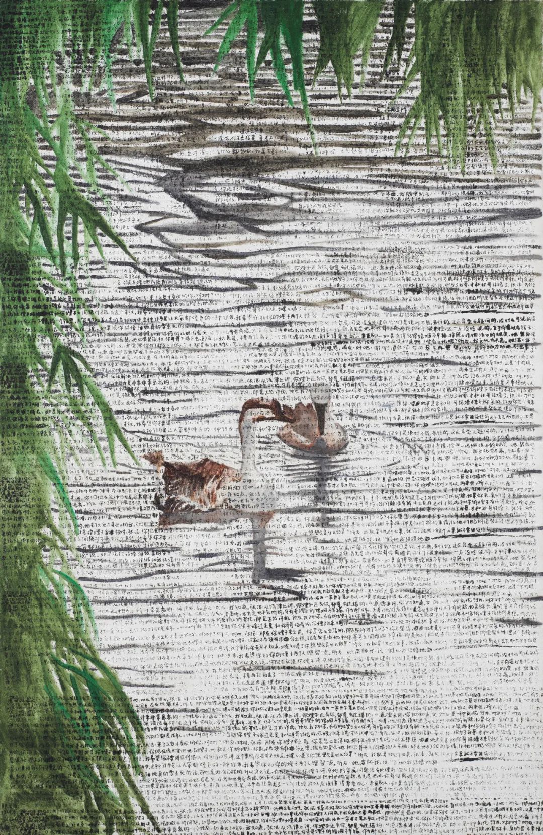 在这一系列作品中,段建宇选择了“桂林山水”这个符号,包括有点古代风景的感觉涂鸦式的风景画,例如海南椰子树、牡丹花、黄山、云海,等带有中国味道的东西,并且她认为最有趣的一点是有一种庸俗的东西在里面,如《早安 10号》画面通篇写满了密密麻麻的小字。从某种角度来看,段建宇的图文搭建是将图像内化为了一种思维语言。而在风格选择上,基于文本的方向性,她甚至仿起山水画的构图,两只鸳鸯的水中漂浮,一幅美好的诗意图景呈现在眼前。同时这种画面氛围也让观者在虚幻与现实之间游刃、穿梭。段建宇乐此不疲地玩味图像与文本构建的做法,对艺术惯有的叙事逻辑与修辞手法带来了挑战。