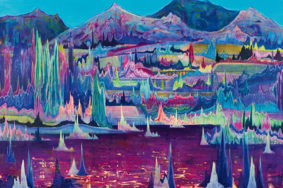 《春之苏醒》中那些被剖开的山体呈现出奇特的剖面结构,如同树木年轮般的线条层层叠叠,既保留了山形的外在轮廓,又揭示了某种内在的时间痕迹。 河中突兀崛起的小山丘打破了自然逻辑,却建立了艺术图景,创造出一种心理上的真实感。画面中荧光色彩也不是对自然的摹写,而是对记忆与想象的重构。