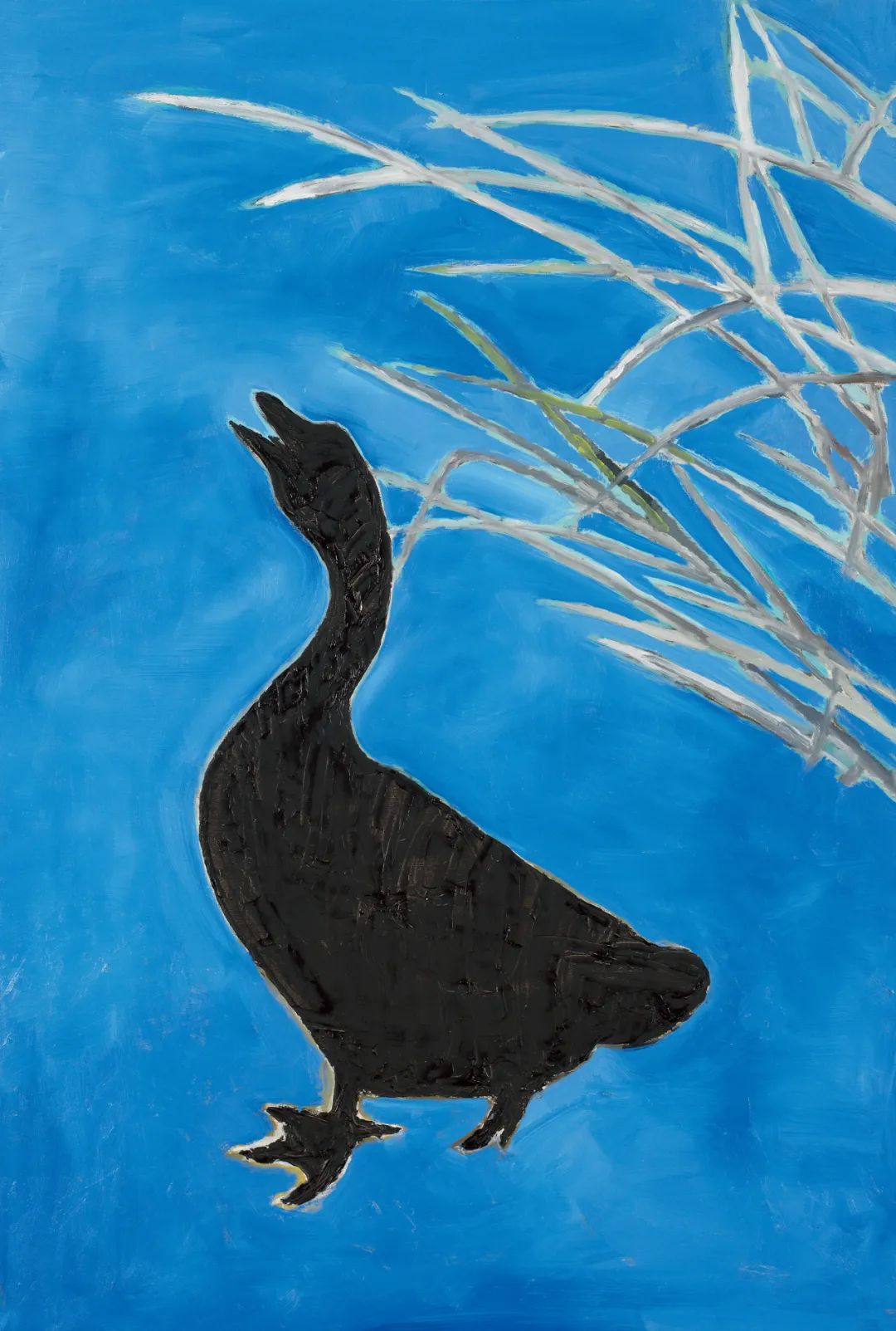 《秦》是赵刚以动物为主题的代表性作品之一,画面以一只黑色鹅的剪影为核心,背景铺陈大面积的蓝色。鹅的姿态雄赳赳、气昂昂,线条刚劲有力,既具象又充满象征意味。艺术家通过极简的造型与强烈的色彩对比,赋予这一寻常家禽以威严的气势,令人联想到中国传统绘画中常表现的“鸿鹄之志”或“威武不屈”的精神意象。作品在形式上融合了剪纸艺术的轮廓感与当代平面构成的张力,而深邃的蓝色背景则暗示了广阔的天空或水域,进一步强化了主题的宏大感。赵刚以现代视角重新解构了传统题材,使《秦》成为一幅兼具文化厚度与视觉冲击力的佳作。