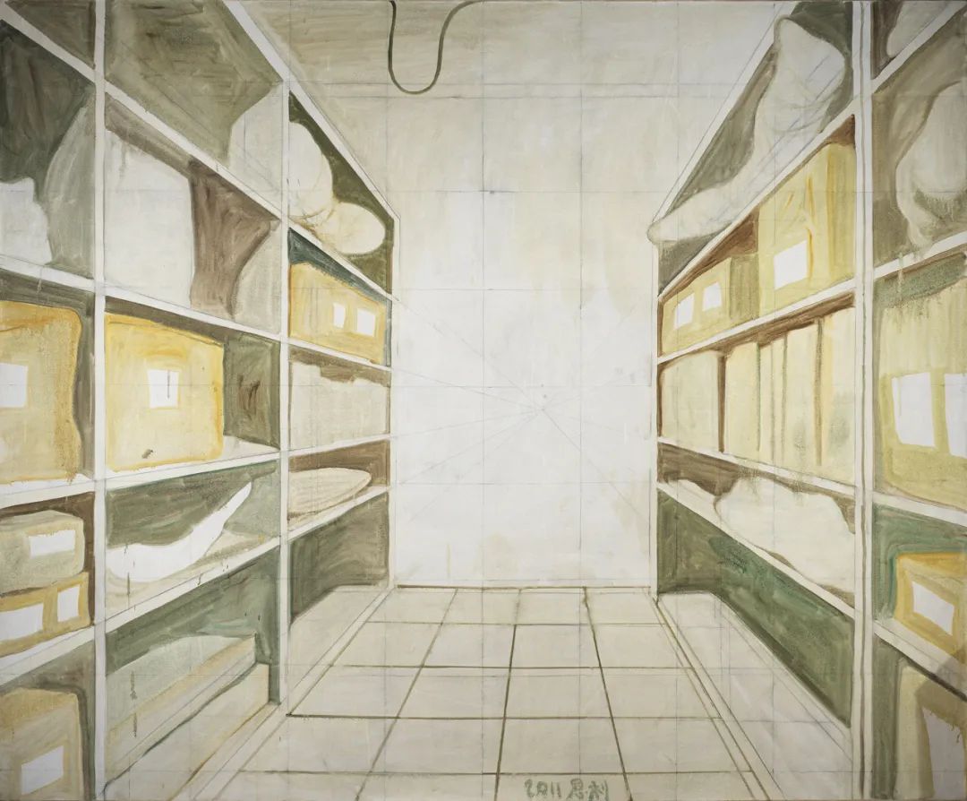 此次春拍呈现的《储藏室》正是这一时期具有代表性的作品。 画面以近乎素描式的冷静语言,描绘了一间规整至极的空间。两侧对称的货架中堆叠着包裹和纸箱,物品无声地排列,像是档案,也像是被收起的记忆。色彩克制至灰绿与黄褐,带着工业感的冷光和清洁感,画面仿佛是生活本身在被轻轻地冷藏处理,却也因此放大了事物本身的质地与在场感。天花板垂下的一截黑色电线如同残余的神经末梢,在极度安静中透露出一丝悬而未决的紧张。它既是一个存放物的空间,也是一个关于遗忘、秩序与封存的寓言装置。 这里的每一个格子,都是一个社会中人内心被规整却未必安放的角落。