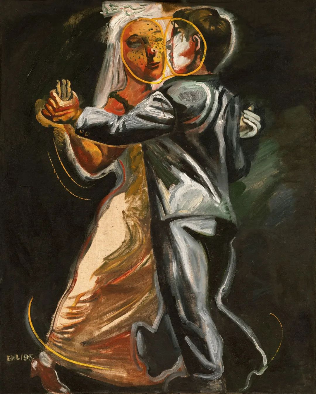 《红脸汉子》就创作于这一时期。 这是一幅具备强烈身体感和绘画冲动的画面,红色在中央以几乎压倒性的方式爆裂开来,占据了视觉的主场。它不是构图意义上的“中心”,而是一种感官的核爆点,混合了焦躁与某种自我吞噬的张力。顶端的深蓝与褐黑交错成球状,仿佛悬浮着的未爆弹,情绪的边缘在此处收紧,形成了一个与红色炽热恰成对峙的冷核。而底部那片泛黄区则仿佛是残留的地面,黄色像尘土中透出的碎金,却被红色所渗染,边缘被一圈近乎书写性的深褐色笔刷所环绕,形成一种节奏化的“画面低语”。