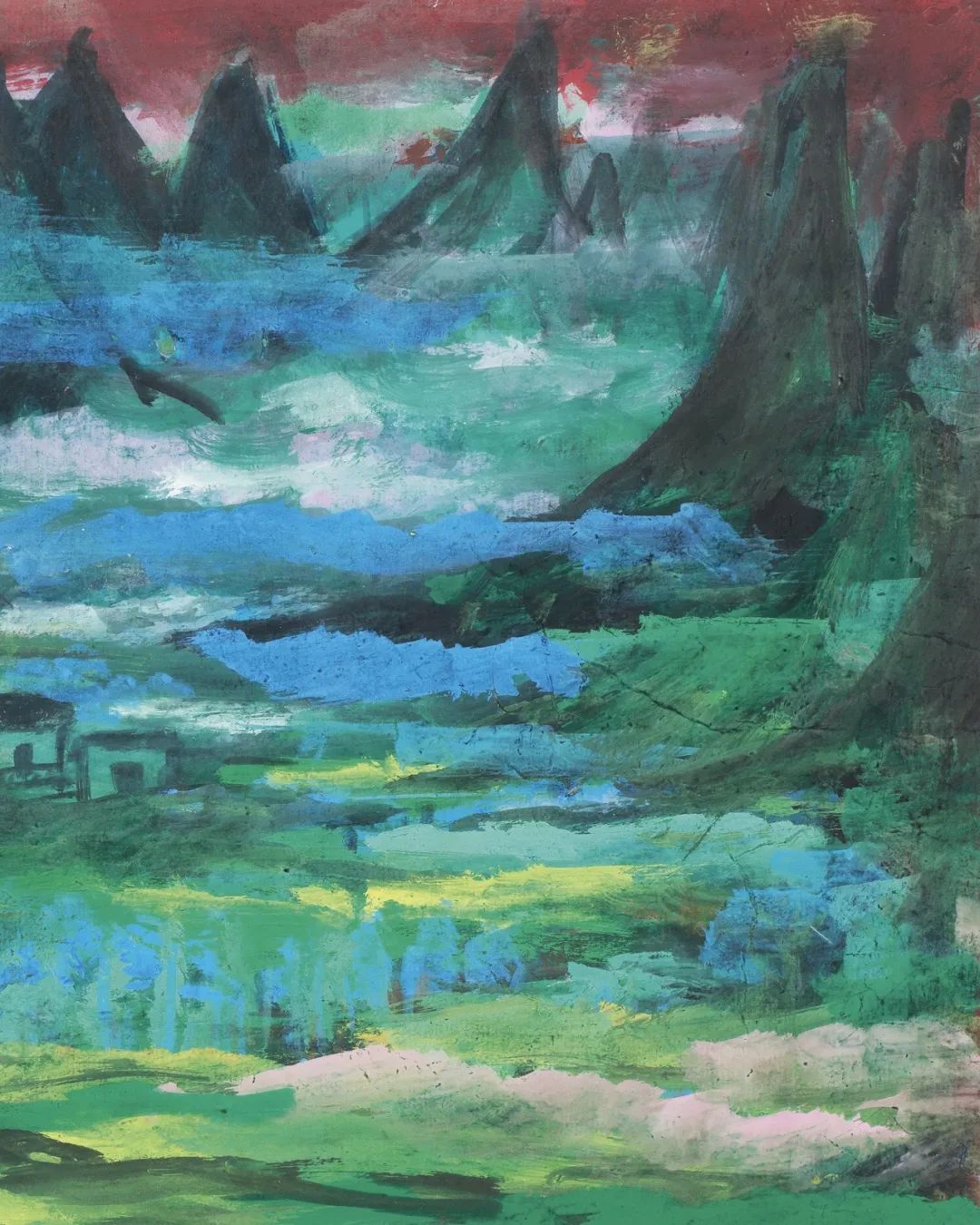 作品的笔触和肌理处理同样值得深入解读。林风眠在这一时期的重彩作品中常常采用厚涂、堆叠、反复渲染等技法,使画面表面形成丰富的物质层次。 这种处理方式明显突破了传统水墨"薄施淡染"的美学规范,创造出一种更具触觉感的视觉体验。重墨画出的山峦不仅以形态存在,更以物质性的存在感压迫着观者的视觉;云雾的渲染不是飘逸的空灵,而是具有重量感的色块堆积。这种对媒介物质性的强调,使作品在视觉上获得了某种永恒感——仿佛风景不是瞬息万变的自然片段,而是凝固在时间长河中的永恒一瞬。这种永恒感或许正是艺术家在动荡年代中对精神家园的执着守望。