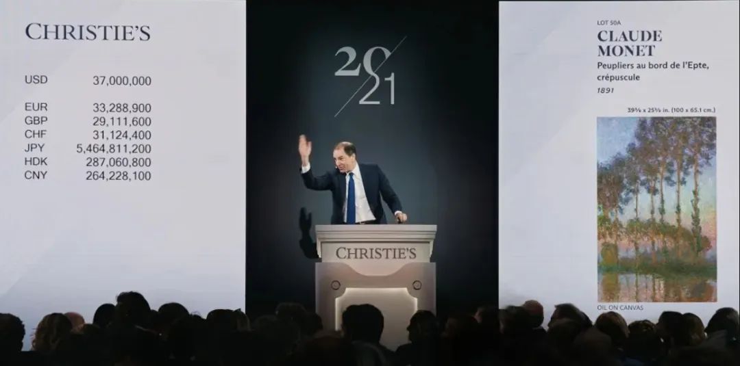 “二十世纪晚间拍卖”,克劳德·莫奈《黄昏下埃普特河岸的白杨树》竞拍长达五分钟,最终以4296万美元创下艺术家“白杨树”系列的新纪录,这件作品此前一直长期借展给波士顿美术博物馆。