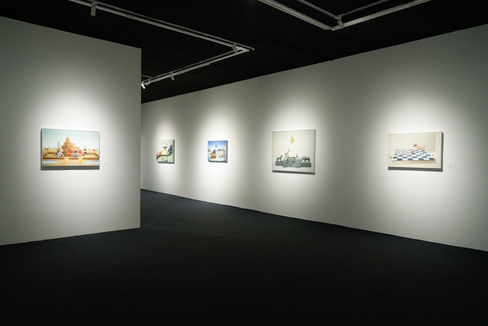 源于设计学的学习背景,张永飞的画面中充满对细节的反复斟酌与试验,物象的搭配和场景的组合均是精心谋划的巧思。他擅长运用细致的笔触凸显平面性,画作被赋予静谧而深邃的质感;画中背景常选用近乎单色调描绘,但当仔细观看时,却发现相近的颜色之间流露出耐人寻味的层次感。由此,整个画面营造出一种神秘内敛的氛围,引发观者的无限遐想。