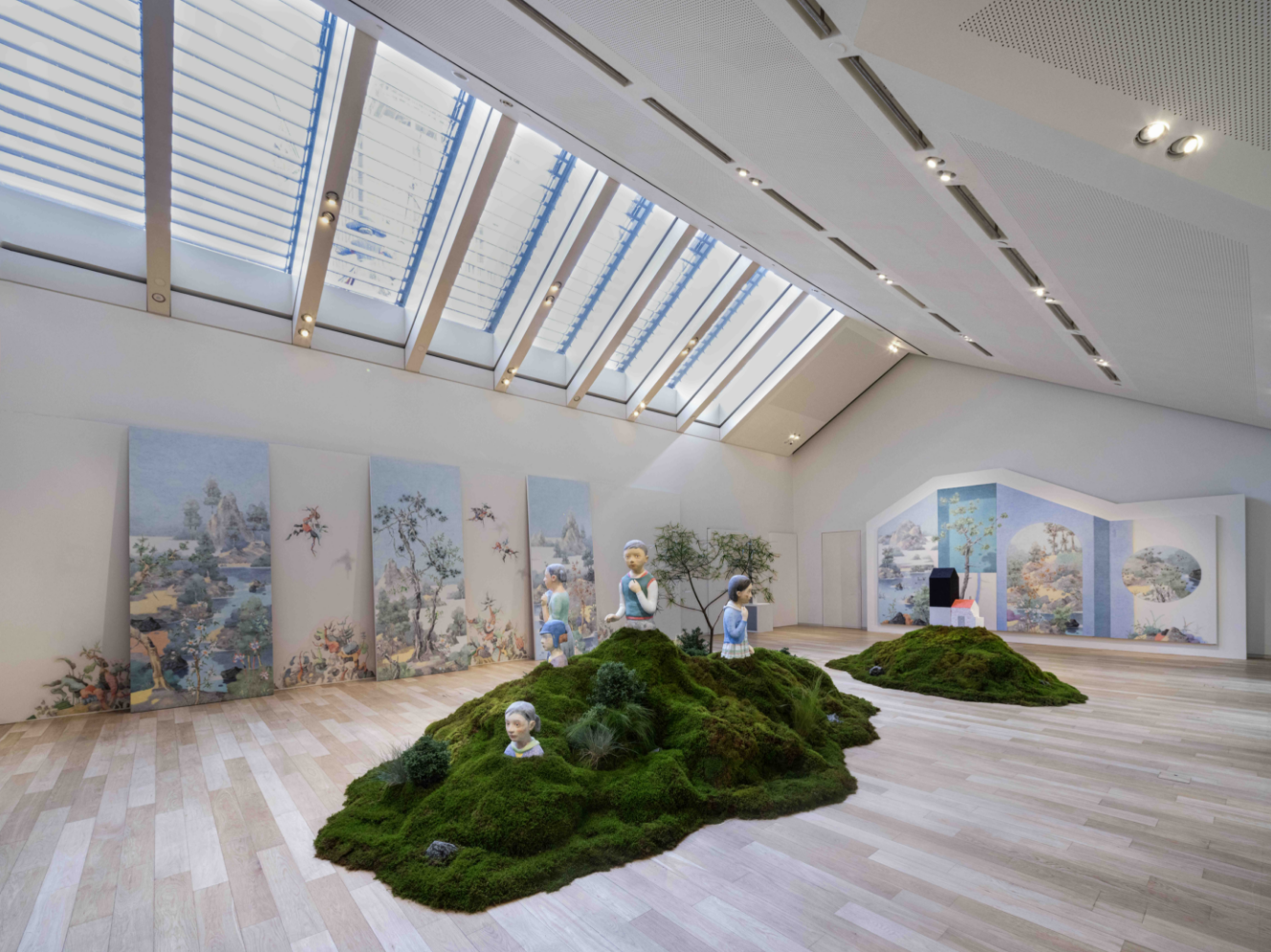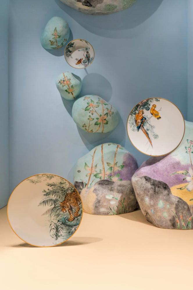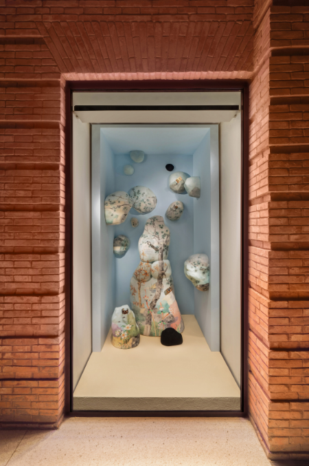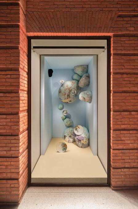 长期研习山水绘画却不囿于传统,曾健勇先生发展出一套基于书法美学的空间抽象法则,将景物山川不断穿插叠加,形成有别于传统“ 三远法”的连续空间。他在纸张背面作画,以斑斓色彩渲染浸润山岚的氤氲水气。他将绘画与雕塑并置,以立体山水揉合记忆、梦境与神话。在本季主题橱窗暨同名展览《乌有园》中,这一创作体系得以进一步推演:上海“ 爱马仕之家 ”入口处,岛屿浮现,苔色蔓生,引观者移步入画。橱窗陈列依卷轴徐徐展开,山水在展览中由象入境,化作穿越古今的园林。正如 2025 年爱马仕年度主题“ 绘聚匠心 ”,此次创作不仅指向绘画的艺术表达,也强调技艺与观念的交汇。艺术家以蒙太奇式的手法造境,实现平面与立体、自然与城市、神圣与世俗、想象与现实的自由连接,于百年建筑内开辟精神花园。