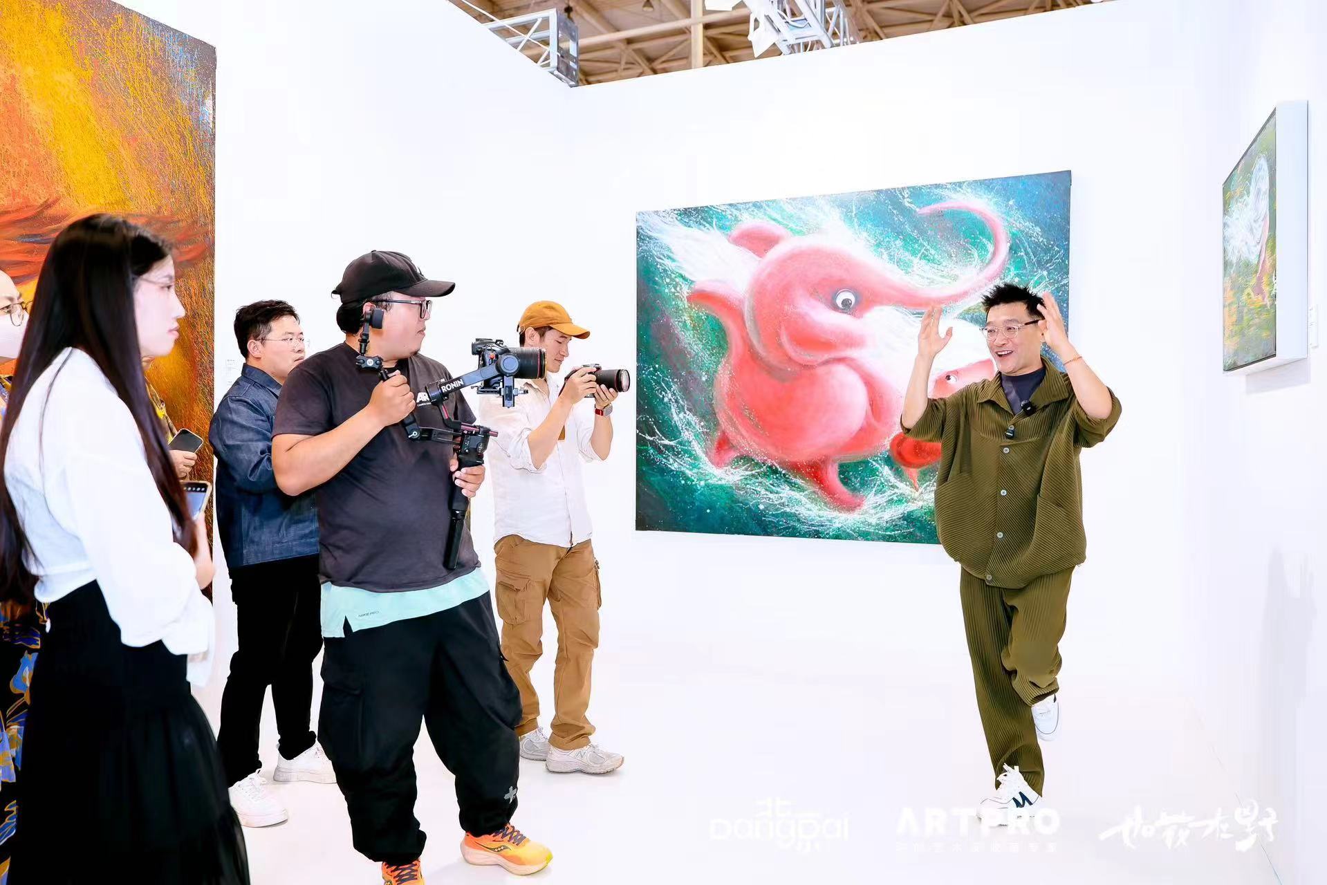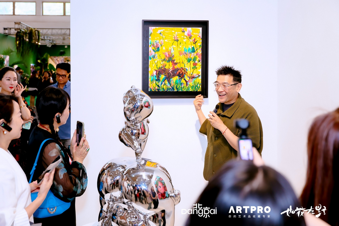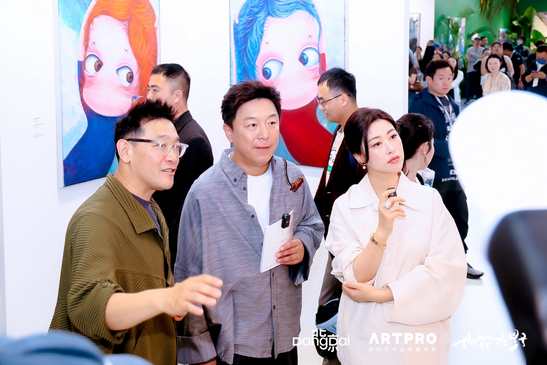 23日,艺术家/演员/导演 黄渤与北京当代艺博会主语人/演员 朱珠一同踏入贾伟KK的艺术世界。在贾伟KK的引导与讲解下,他们逐一欣赏展览中的作品。面对《马上如花》系列架上作品中骏马与「如花」形象的超现实融合,黄渤驻足良久,感叹道:“第一次看到如此大胆的形象碰撞,马的力量感和‘如花’的抽象形态,在画布上产生了奇妙的化学反应。”朱珠则对《如花入梦》系列作品的悠然意境尤为赞叹:“这些画作就像视觉诗歌,色彩与线条的留白,给人无限想象空间。”