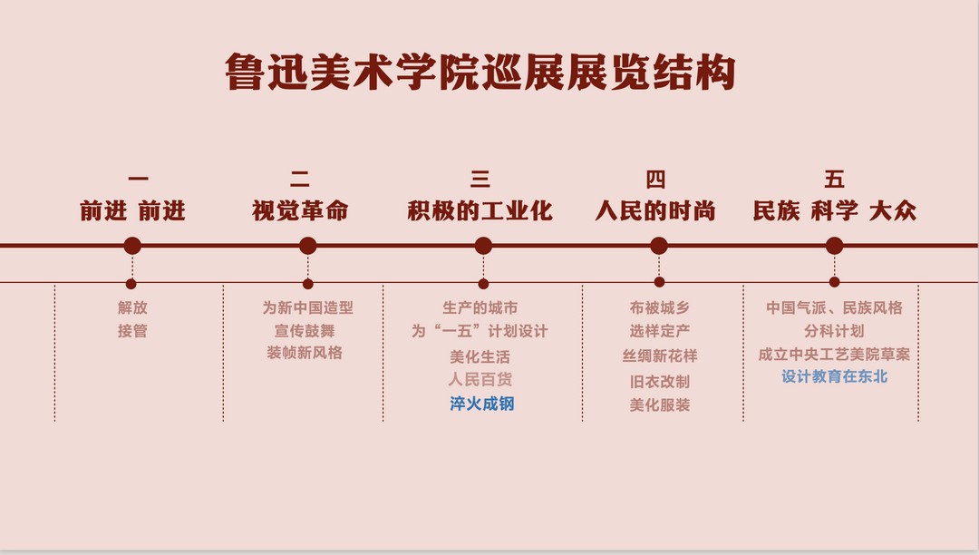 展览包括国家形象设计、宣传画设计、书籍装帧设计、字体设计、产品设计、染织设计、建筑设计等多个类别,囊括了百余位中国近现代历史上诸多重要设计大家,包括张光宇、梁思成、林徽因、钱君陶、庞薰琴、雷圭元、蔡振华、张开济、张仃、周令钊、祝大年、古元、钟灵、奚小彭、常沙娜、张道一等。展览将设计置于广泛的社会发展、时代变革、人民生活的语境中,兼顾地域的广阔性、类别的多样性,分别从“前进 前进”“视觉革命”“积极的工业化”“人民的时尚”“民族 科学 大众”五个板块展开叙事。