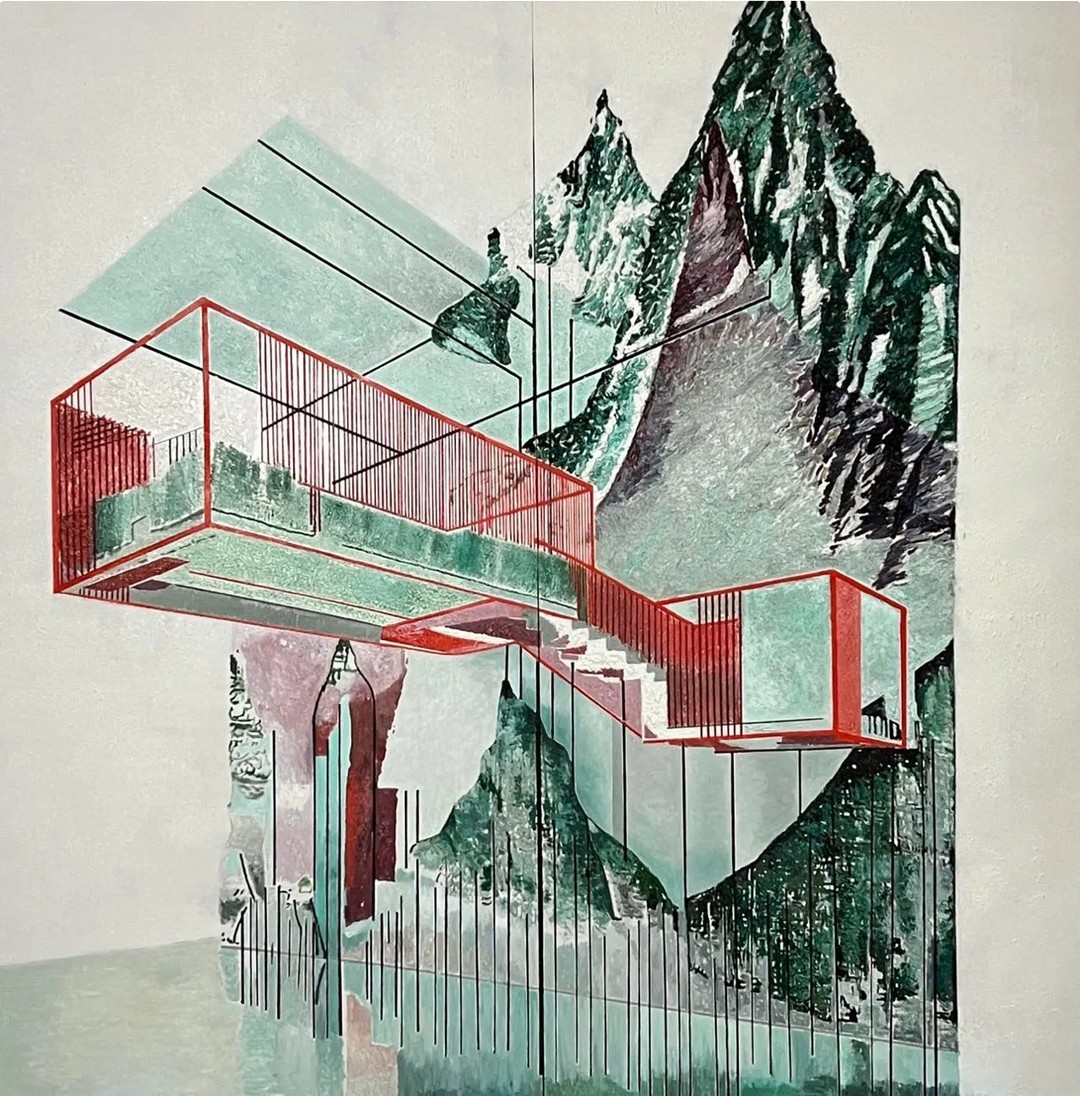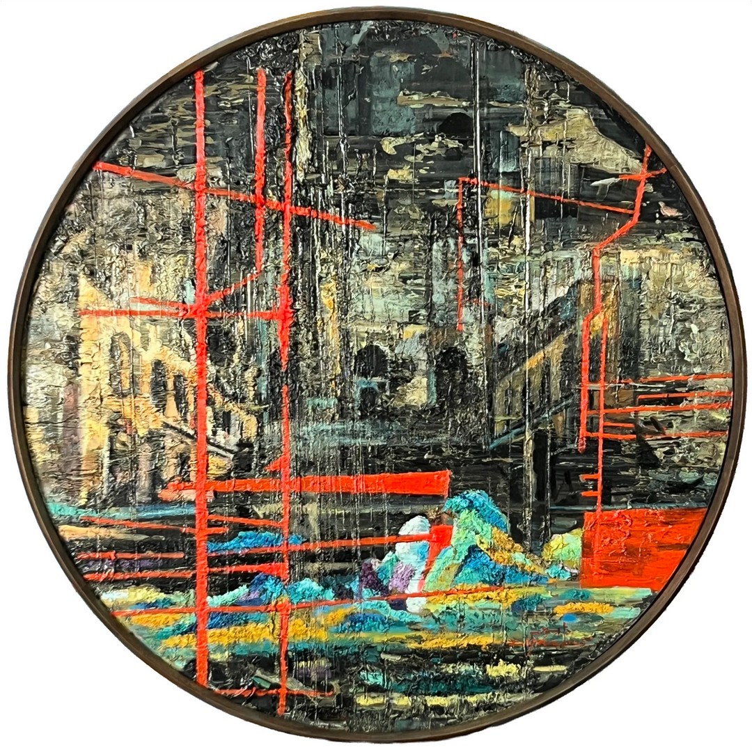 在这件为罗马达芬奇博物馆展览特别创作的油画作品中,艺术家子朴巧妙运用多元艺术语言,构建了一个独特的时空交融场域。作品精心整合了艺术家精湛的抽象技法、"生图时代系列"中的特征符号元素、宋代《千里江山图》的传统山水美学,以及古罗马建筑的经典元素。通过这种精心编织的视觉语言,作品成功营造出一个富有张力的艺术空间,展现出中国与意大利两大千年文明的深度对话。