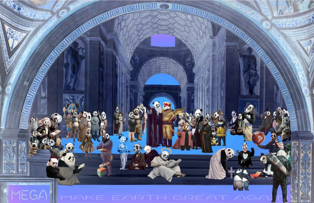 《超级雅典学院》呈现了一场富有深意的跨文明对话。该作品以拉斐尔的《雅典学院》为基础,陈静巧妙汇集了东西方重要思想家:从轴心时代的老子、孔子、庄子,延伸至文艺复兴时期的柏拉图、亚里士多德,并融入现代的马克思、图灵、霍金等重要人物。艺术家运用数字技术精心塑造这些人物形象,并为其配以富有象征意义的元素:展现特朗普研读《新资本论》的场景,描绘奥本海默与图灵专注于《薄伽梵歌》的画面,同时在构图下方巧妙布置《AI》、《星际探索》等现代著作。这种独特的艺术编排深入探讨了科技、资本、信仰与文明之间的内在联系。作品将"Make America Great Again"升华为"MEGA(Make Earth Great Again)",启发观众超越地域局限,以更加宏观的视角思考人类文明发展的方向。