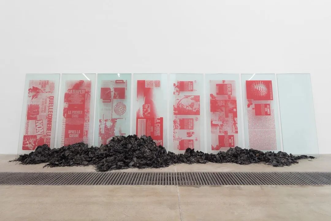 1993,烧过的报纸、报纸灰、绳子、玻璃、玻璃上丝网印刷,尺寸可变