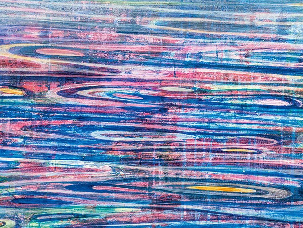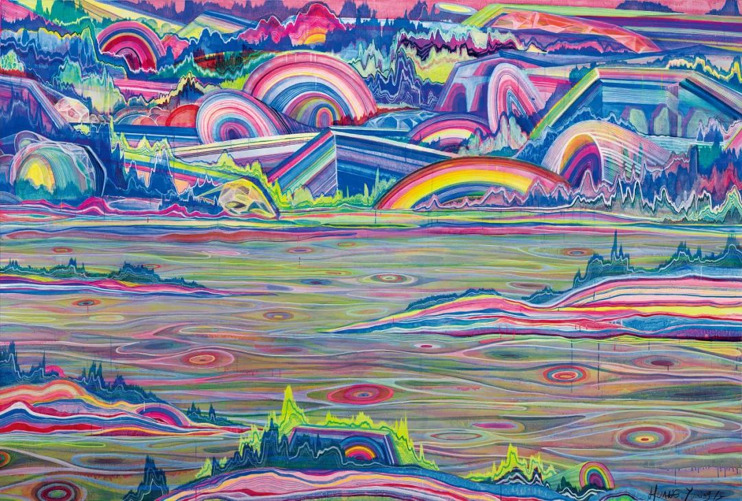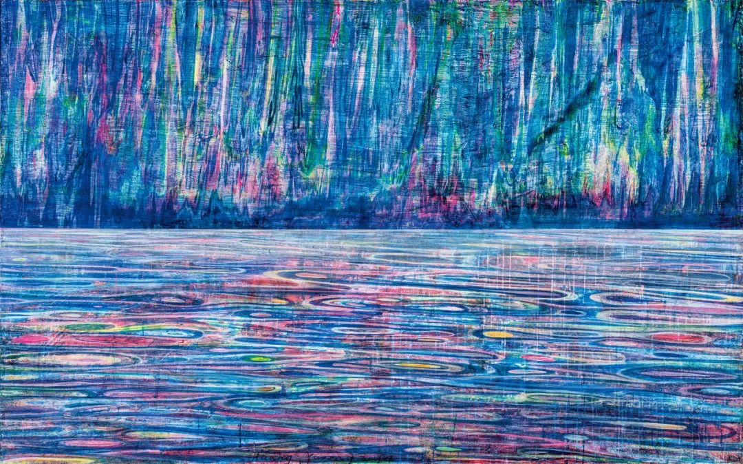 在绘制时,黄宇兴先用群青、深红等重色铺底,然后再用其他透明度更高的荧光色不断向上覆盖,如此循环往复为画面注入强大的能量。大小不一、相互交织的椭圆形漩涡在画面中不断地铺陈和扩散,色彩的堆叠与线条的流动在画面上营造出强烈的空间错觉,编织出绵延深邃的层次感。甚至,他还会对画面进行水洗、打磨等后期处理,来塑造一种如同时间荡涤般的肌理质感。在本作中,黄宇兴不仅展现出对于色彩和画面技巧的强大驾驭能力,也通过对自然的诗性处理,放大了个体生命经验和宇宙秩序之间的深层关联,赋予了作品强烈的形而上意味。